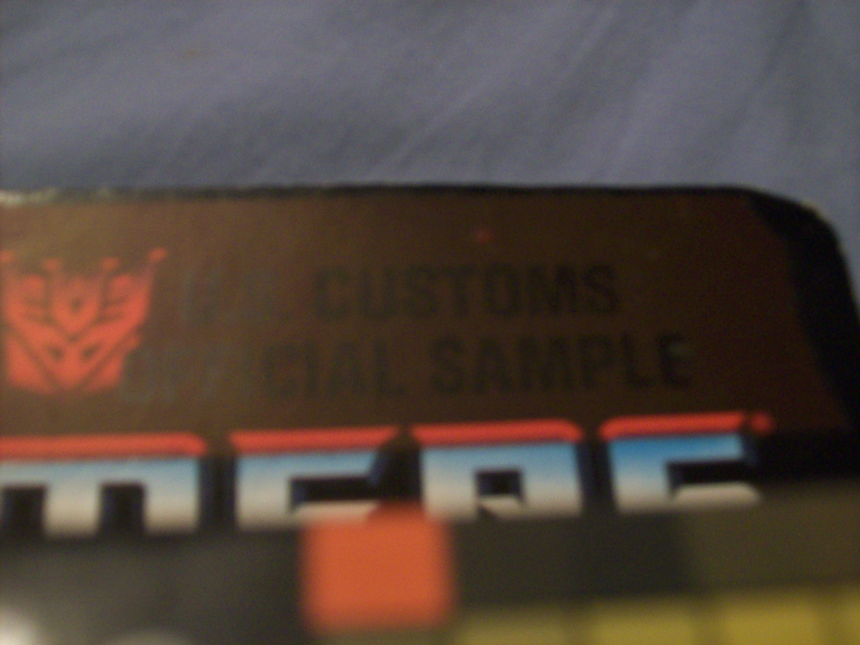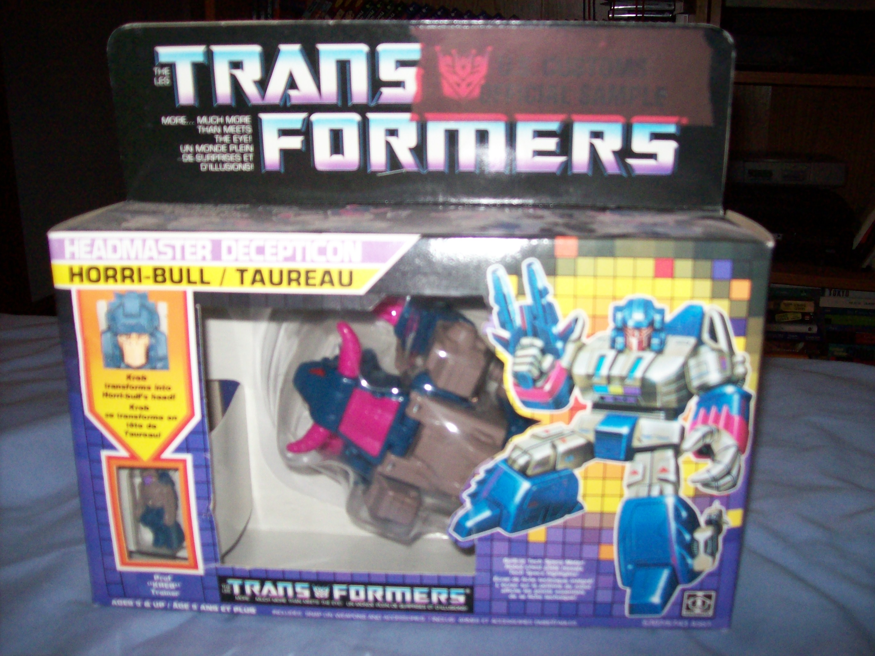 This toy is, I believe, a 1987 Transformer. It is a rare US Customs Sample, meaning (if what I am told is correct) less than a 100 were made, and most of these were destroyed as was policy. This one survived by being taken home by an employee, and fell into my hands. It is a decepticon, n amed horri-bull, in near mint condition still in package, with the official "US CUSTOMS SAMPLE" logo clearly etched into it on the top. It's US/Canada toy, so the package is authentic in both English and French. It comes with a Prof. "KREB" trainer as well. I'm looking for any help in appraising this toy, and I'm interested in selling it for the right price.