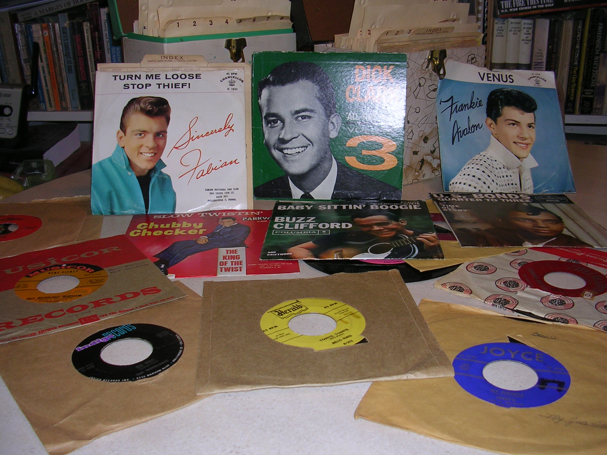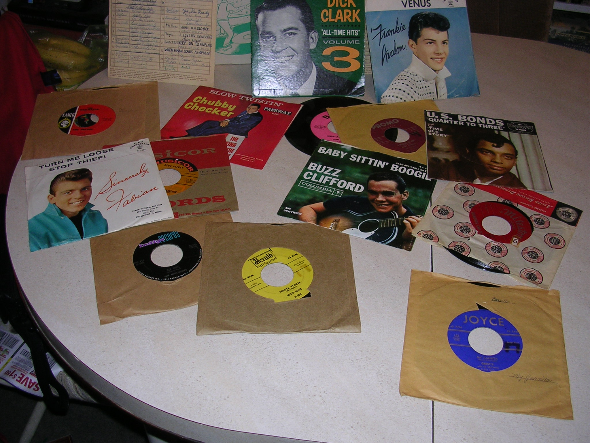 "Kansas City" --Wilbur Harrison, "Teenager in Love," "Love Came to Me," --Dion/ and the Belmonts, "Venus," "A Boy Without A Girl/From Bobby Sox to Stockings," -Frankie Avalon (pictured jackets), several best records of The Shirelles, "AT the Hop" --Danny & the Juniors, "Shop Around" -(Smokey Robinson &) THe Miracles, Paul Anka, Santo & Johhny, "Daddy's Home" -Shep and the Limelights, "Stagger Lee" --Lloyd Price, "Itsy Bitsy Teenie Weenie Yellow Polka Dot Bikini," "Baby Sittin' Boogie" --Buz Clifford (picture jacket), "Please Love Me Forever" --Cathy Jean & the Rommates, "Wah-Watusi," Louie, Louie" -The Kingsmen, "A Quarter to Three" -U.S. Bonds (picture jacket), The Crests (several unique records spanning their first two record labels), "Turn Me Loose" -Fabian (picture jacket), "There's a Moon Out Tonight" -The Capris, A unique, "All Time Hits, Vol. 3," - 6 songs on a 45 put together by Dick Clark (cardboard, pictured jacket), "When A Man Loves A Woman" --Percy Sledge, Chubby Checker (picture jacket)The Tokens, Gene Pitney, Roy Orbison (several), "Earth Angel" -The Penguins, "Those Oldies But Goodies" --Little Caesar & the Romans, Paul & Paula, "A Million to One," "Tallahassee Lassie" -Freddie Cannon, The Innocents, the Paradons, Mello-Kings, "Once Upon A Time," The Marathons, Coasters, The Juveniles, Mary Wells, "Alley-Oop" -Dante & the Evergreens, "Yes, I'm Ready," The Toys, McCoys, Gentrys,Gary Lewis, The Cascades, "Hey Girl," Lou Cristie, "I Will Follow Him," He's So Fine," Hey, Girl," "Theme From A Summer Place" -Percy Faith Orch, Theme From The Apartment, "The Wayward Wind," "I Talk to the Trees," "A String of Trumpets," "(Yakiti-Yak) Blah Blah, Blah Blah," "Petite Fleur," etc., etc., etc.