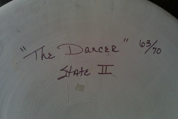 rc gorman ceramic piece. "THE DANCER" "STATE II". 63 OF 70 made. flat, semi-rounded, approx 16" round. like a wall-hanging decorative piece, not a plate. pencil signature on front underneath clear glaze. white/cream colored with charcoal gray color on the lady-line figure. mint condition, same as new. pictures show stamps and writing on back. interested in finding value and possible to sell item as well.