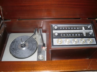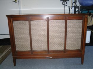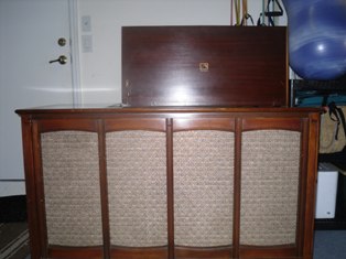RCA Victor Total Sound Stereo Orthophonic High Fidelity Model IVF 1505 with a RCA Chassis RC-1205. AM/FM with stereo broadcasts. It can also play any monophonic record. Had options for an external tape recorder and total sound speaker system. The record player could play up to 12 10 inch same speed records. If the attached spindle was used it could play 15-45rpm records. The RCA player had cosmetic scratches on the top and one area on the right corner that popped out when moving. It is about 2" square. I had to piece it back with wood glue. The player and radio still play and it gives great rich sound. I'm not sure of the value but it can be of great value for someone who is willing to refinish the top and get a new record player needle. Other than those minor defects the system is in good condidion.