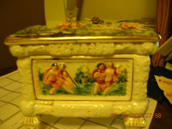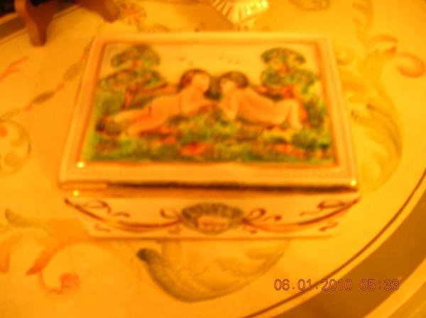 Photos below: Both boxes are white, trimmed in gold. Cherubs are on both boxes, not detailed but are surrounded by what looks like a creek with green foliage. Large box on ceramic legs, both have lids. Small box signed by R.Capodimonte with Italy written in gold. Large box has mark of the crown/shield/tree limb foliage with G on one side B on the other. #2105 and Italy also written in gold on the bottom.