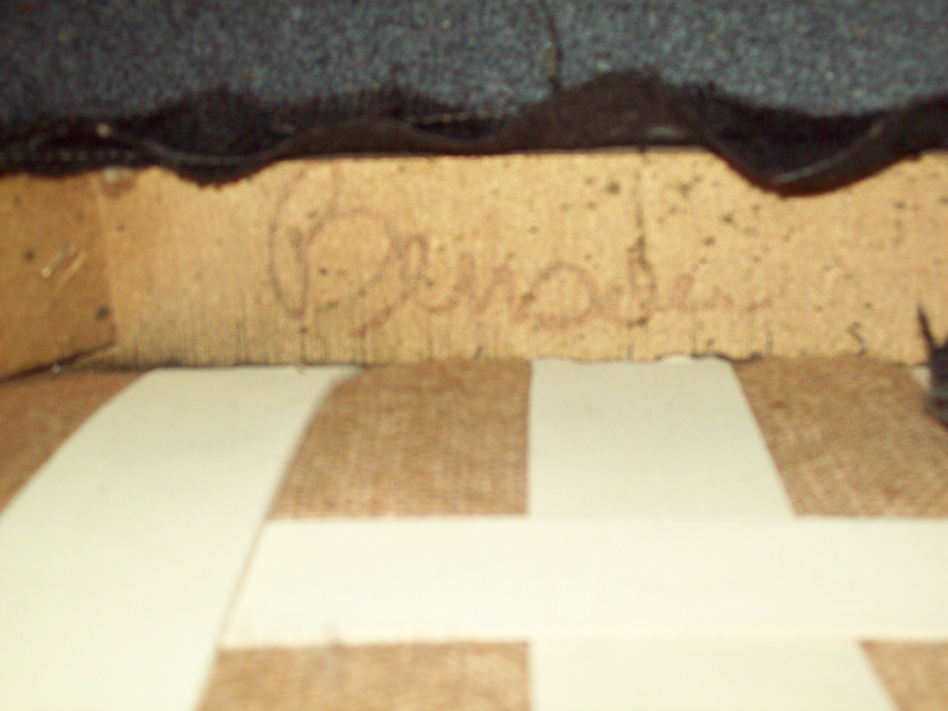 This is a wood arm chair with a removable pillow, see pictures for photos of with the pillow in place and without the pillow in place.  Pictures also show  handwriting underneath the chair itself. The finish is goldish paint with black specs. The fabric is brownish velour, seat cushion worn, fabric faded. on the chair's top is two pineapple looking finials. Chair has embossed wood carvings in 3d around the backrest and around the seat cushion, as well as around the armrest areas. Not sure if this was part of a dining room set or just a single chair.