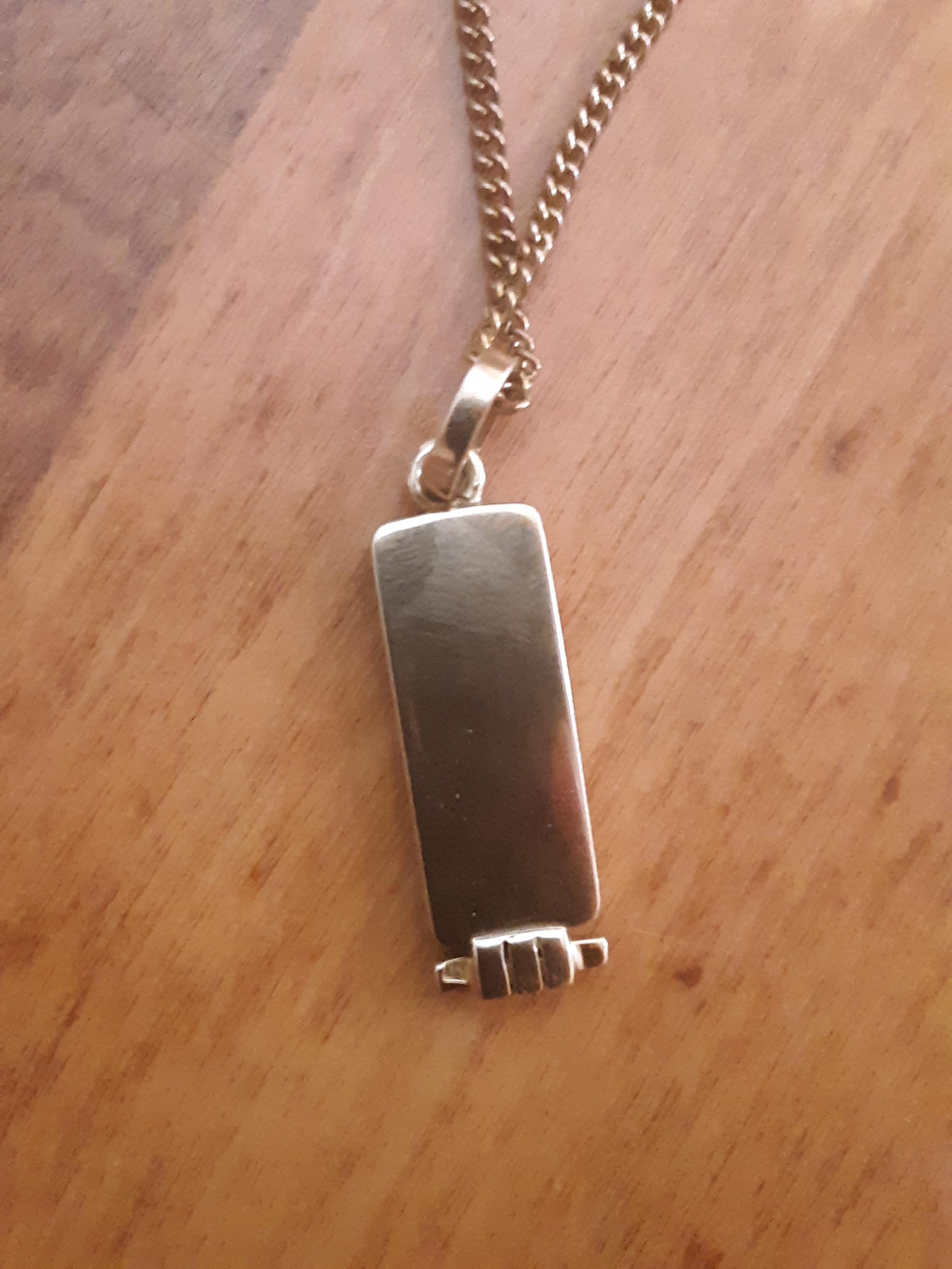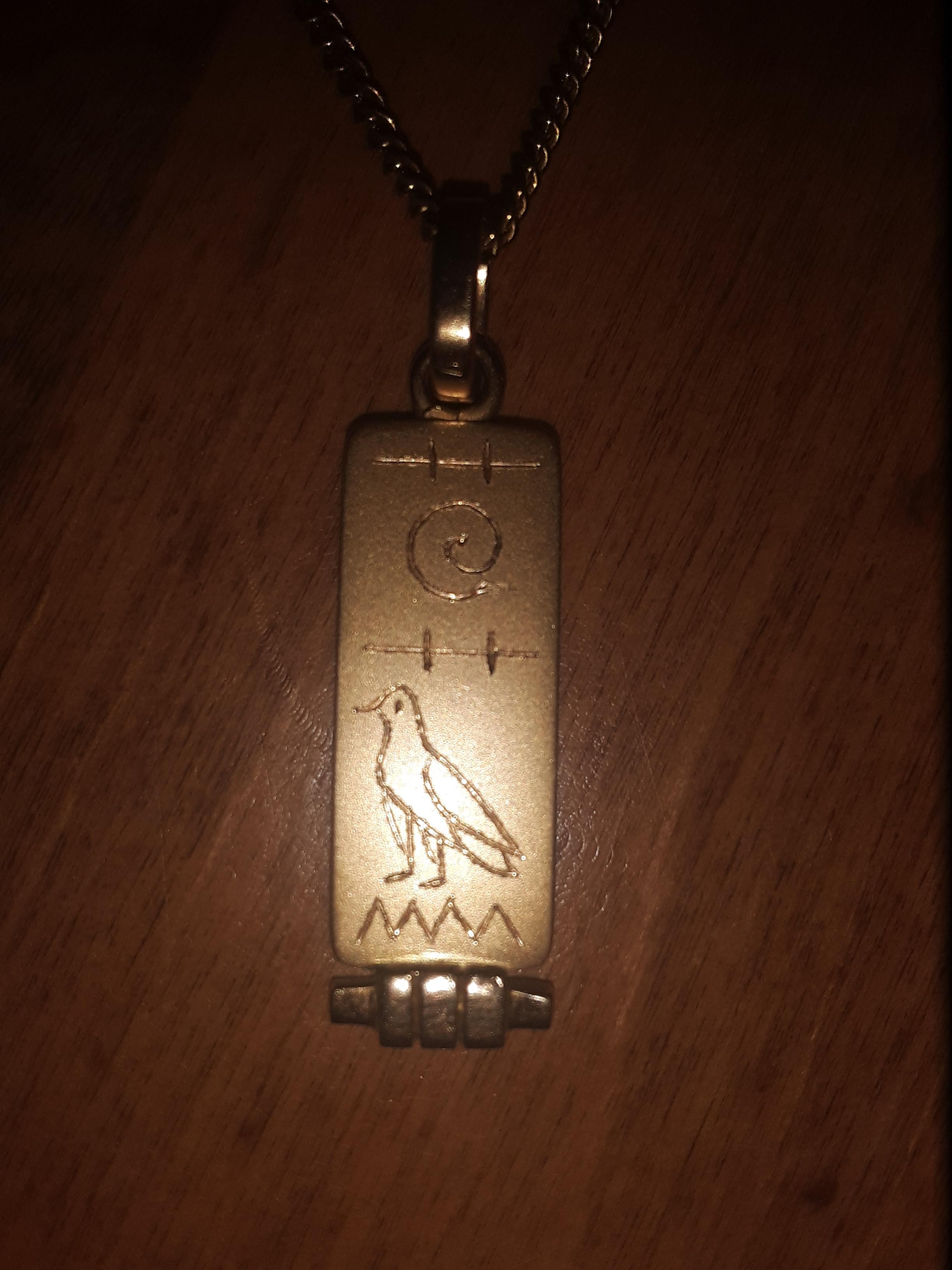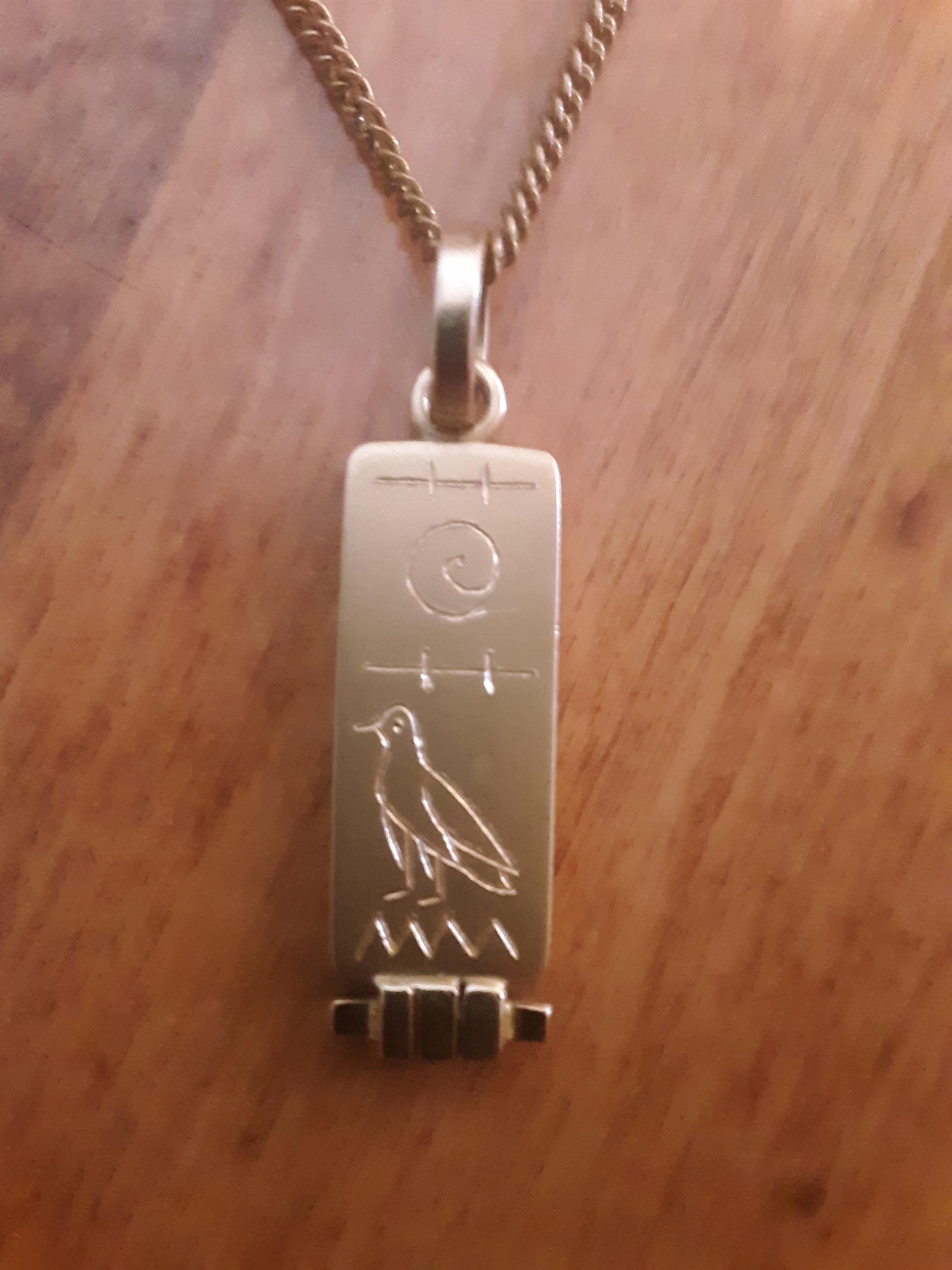 My engraved rectangular gold hieroglyphic Egyptian cartouche necklace is from Galal Jewellery in the Bazaar of Khan El Khalili in Cairo, Egypt. I believe it is from the 1970s, and I am not sure if it is made of gold or only gold-plated silver. It is engraved with the hieroglyphics that spell "Susan".