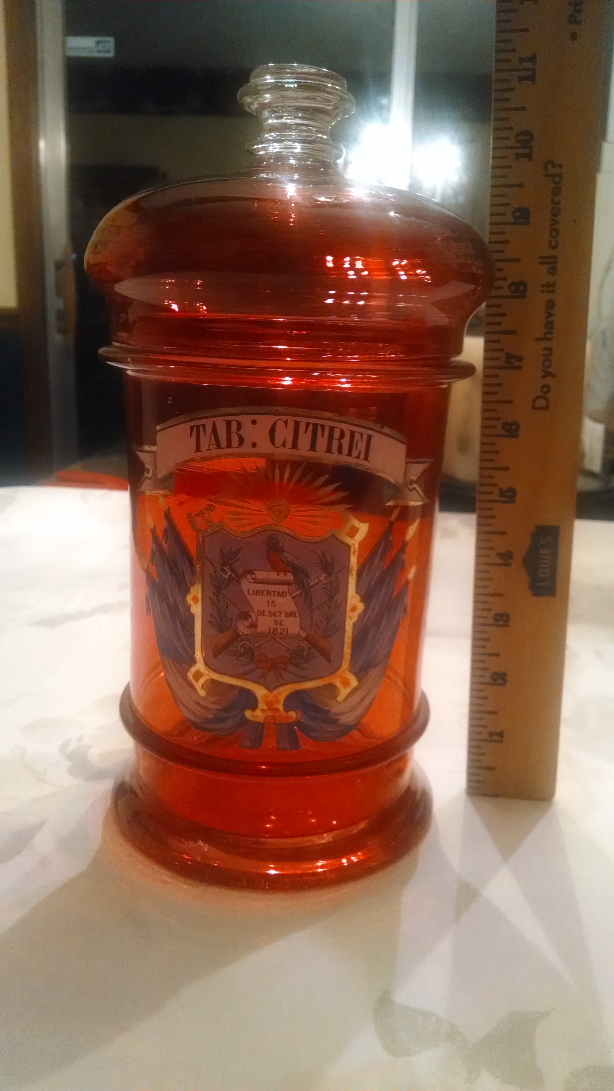 I have 2 of these Ruby red Pharmacy bottles. Very Good condition! Country Crest with flags,guns,swords,blue, with 18ct. trim. TAB: CITREI ANOTHER WITH-TAB:MENTH:ANG GUATEMOLA SCROLL WITH LIBCRTAD 15 DESETBRE 1812 TOP IS 3" TALL AND THE BOTTOM IS 7" BOTTOM SHOWS WAS HAND BLOWN, MARKS FROM SLIDING ON AND OFF PHARMACY SHELVES. CAN ANYONE TELL ME ABOUT THESE ANTIQUE BOTTLES?