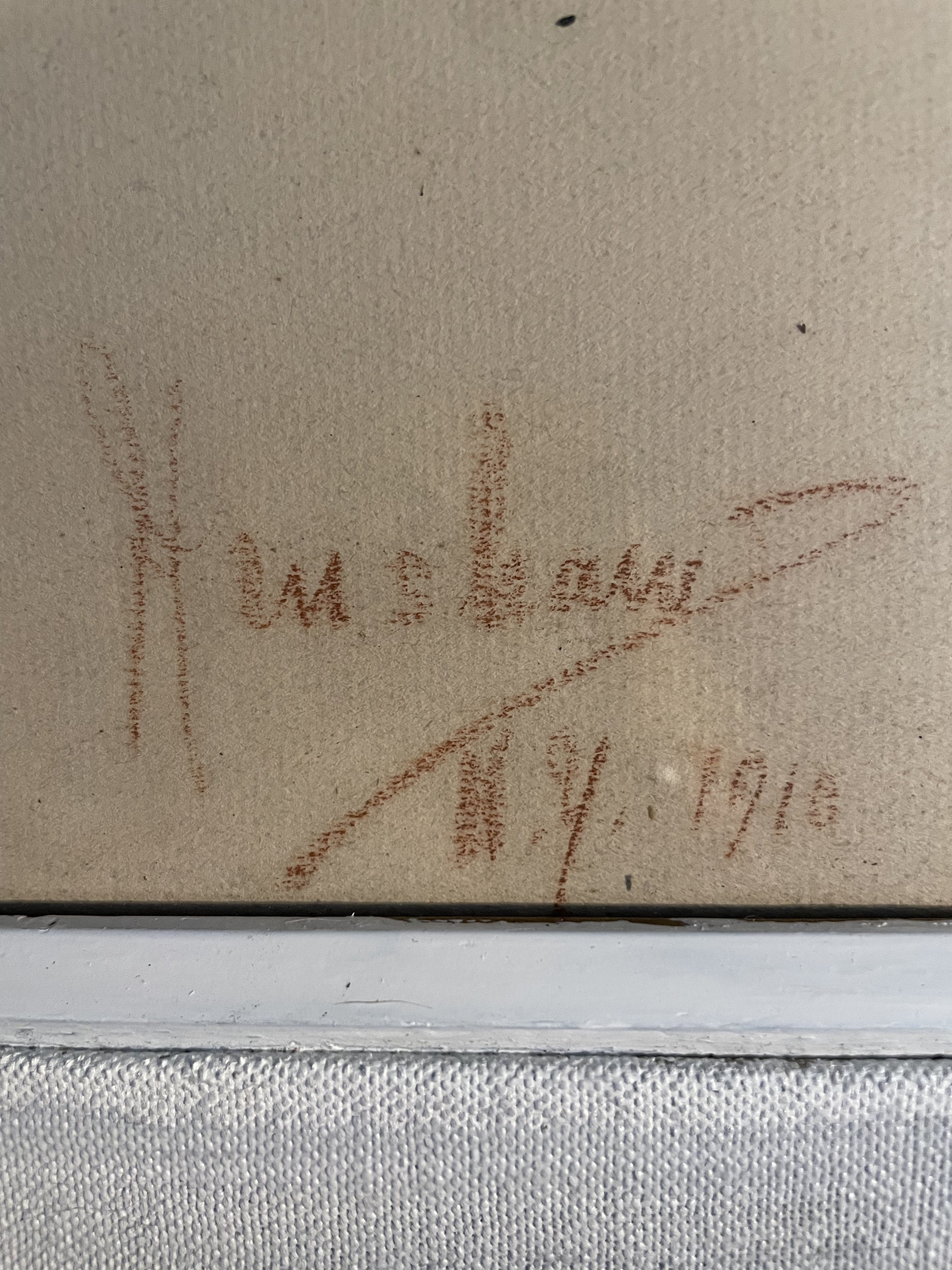 I have a Red Chalk Drawing of a women sitting on a stool I believe with her hand in a fist under her chin posing. It is signed Hemshaw1910.