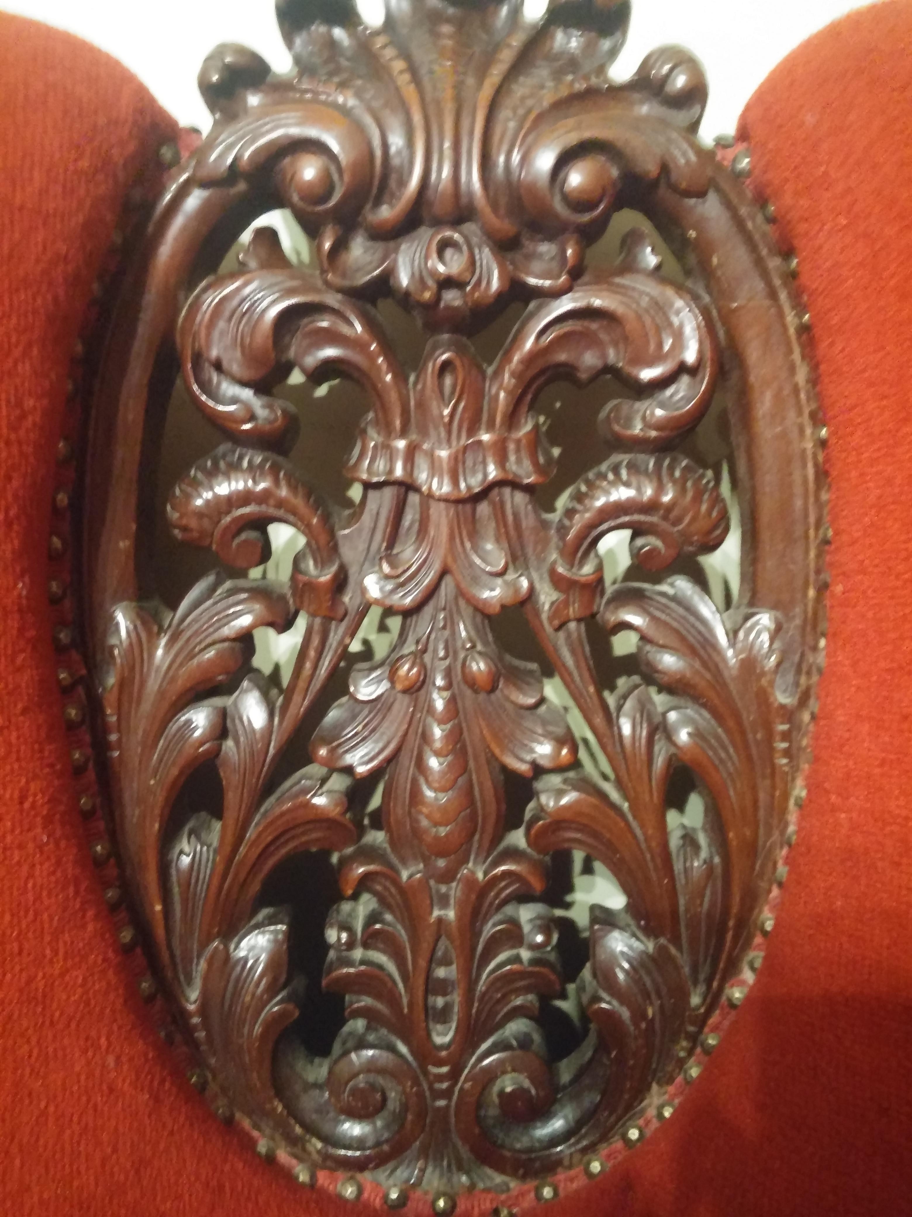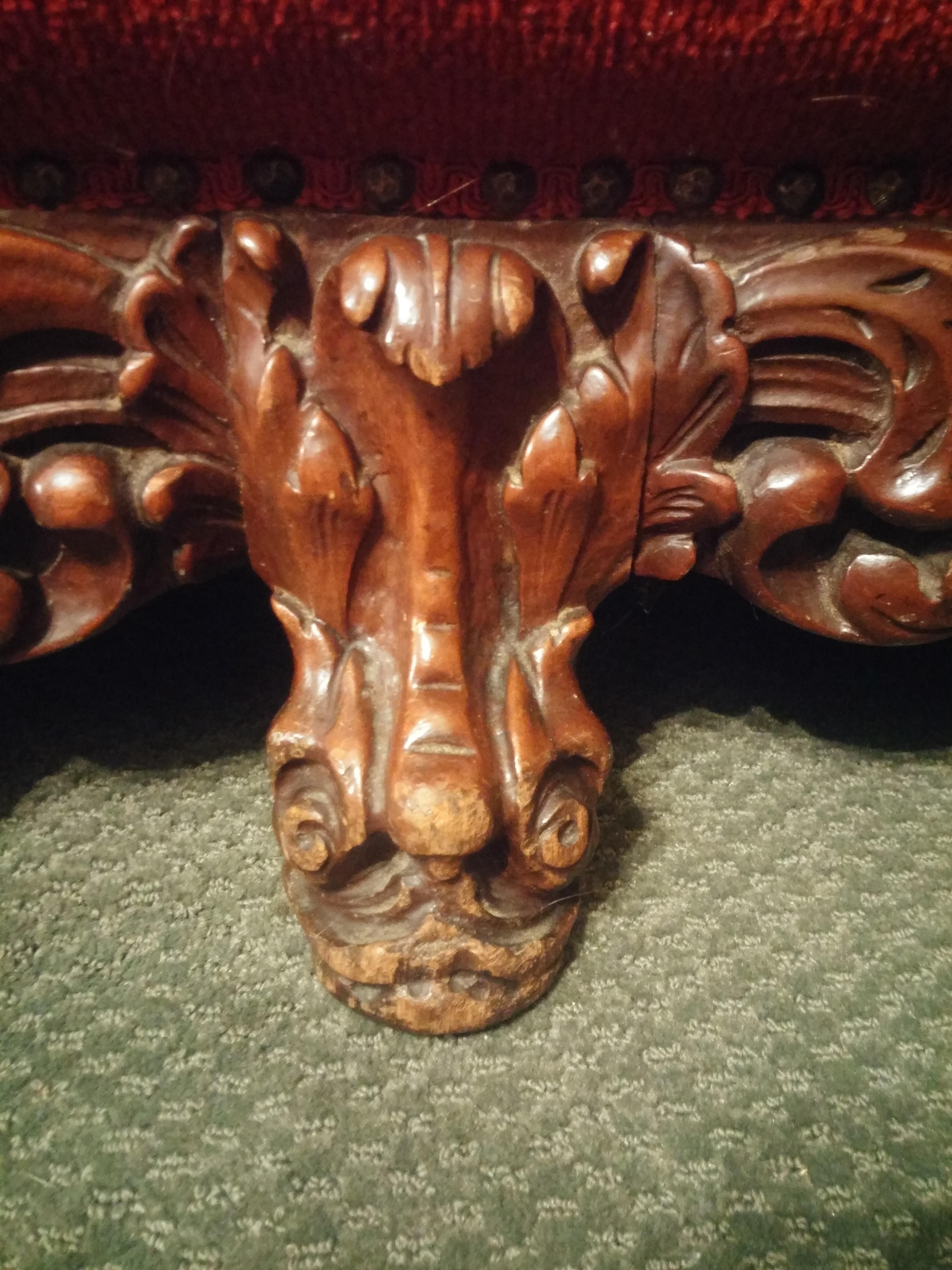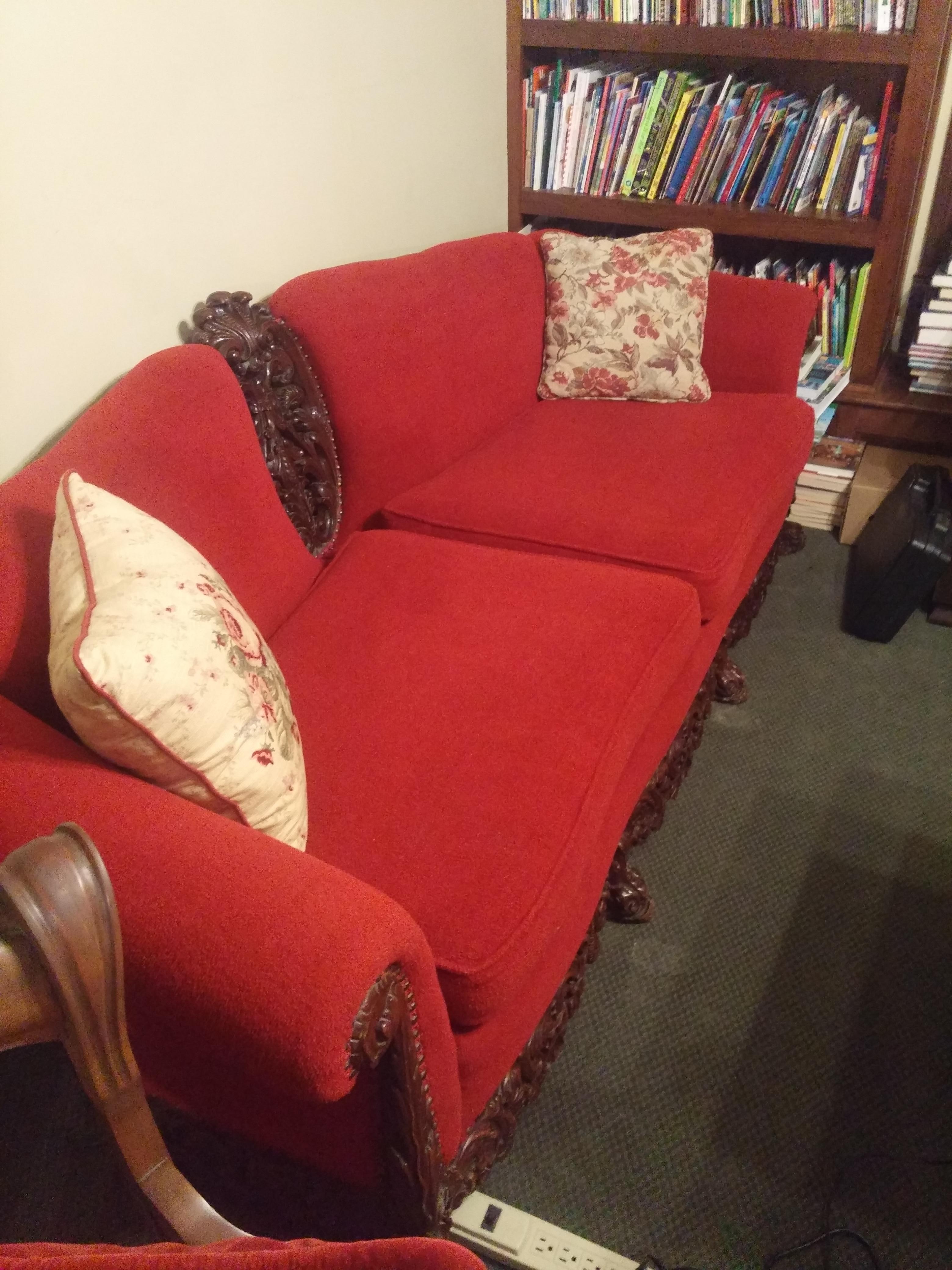 My parents bought the couch from the previous owners of the house we live in currently. They got the couch from California during the 70's. The couch is red with a dark colored wood embroiders, legs, and arms. I did a bit of research and found out the design is called dolphin foot. Along with fish heads on the feet of the couch and full fish on the corner legs; there are also leaf patterns that wrap all the way around the bottom edge of the couch. In the middle is a leafy looking wood pattern. There is a chair that is similar in design, but the couch is what i want to know about for now.
