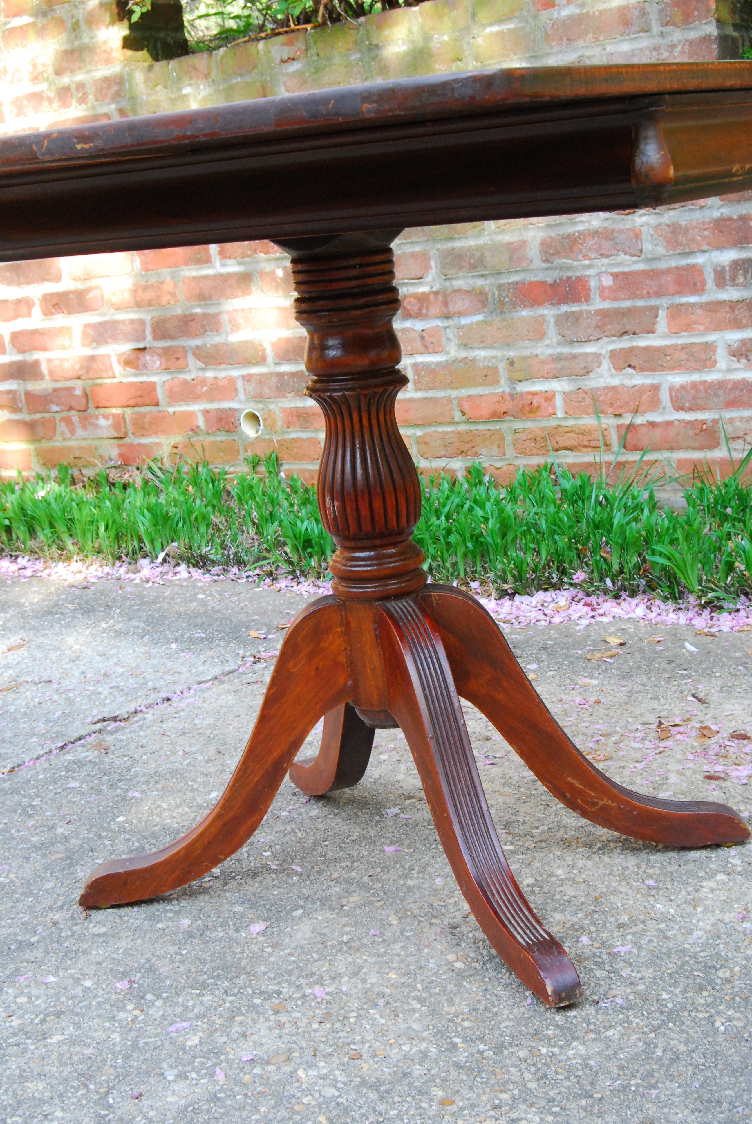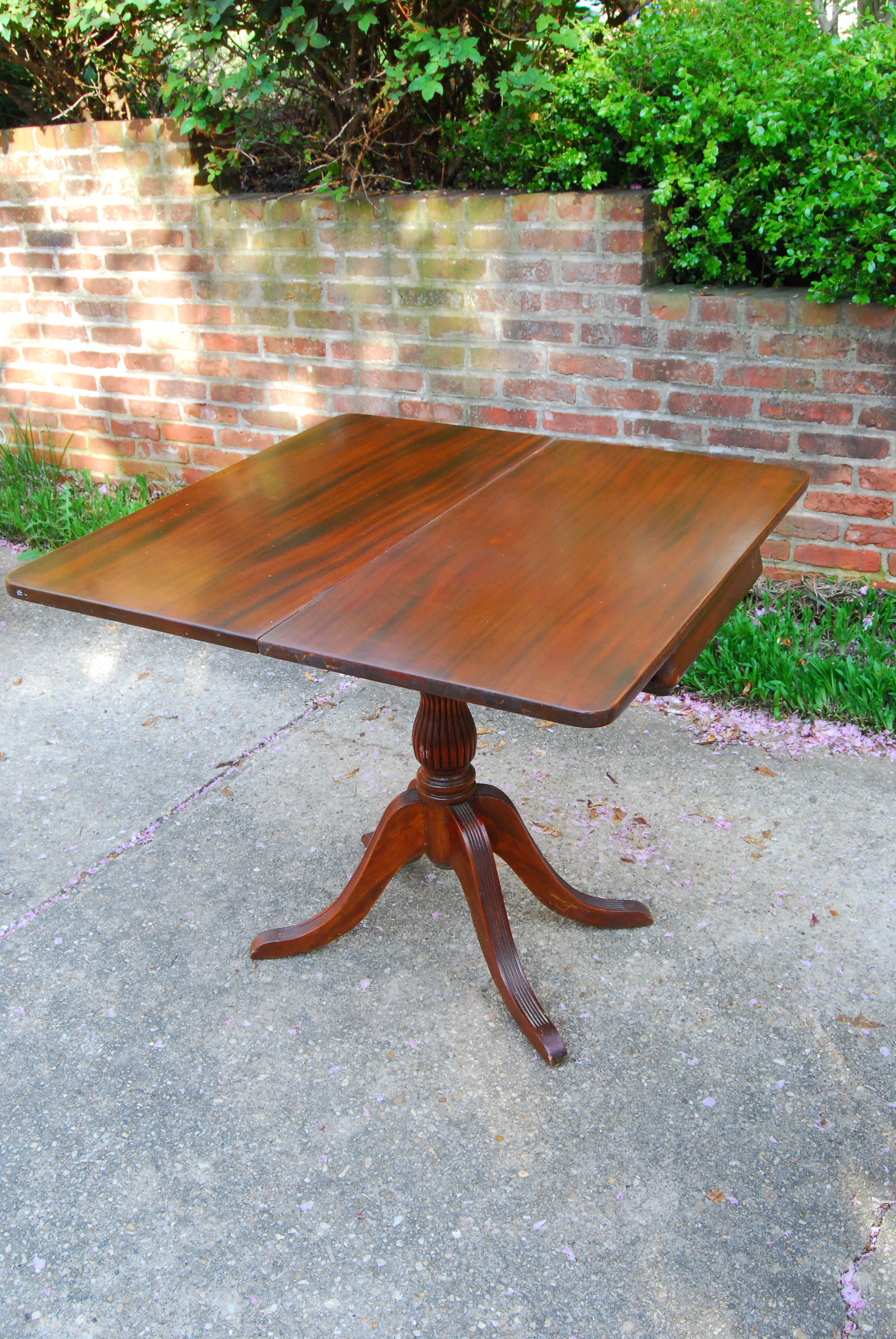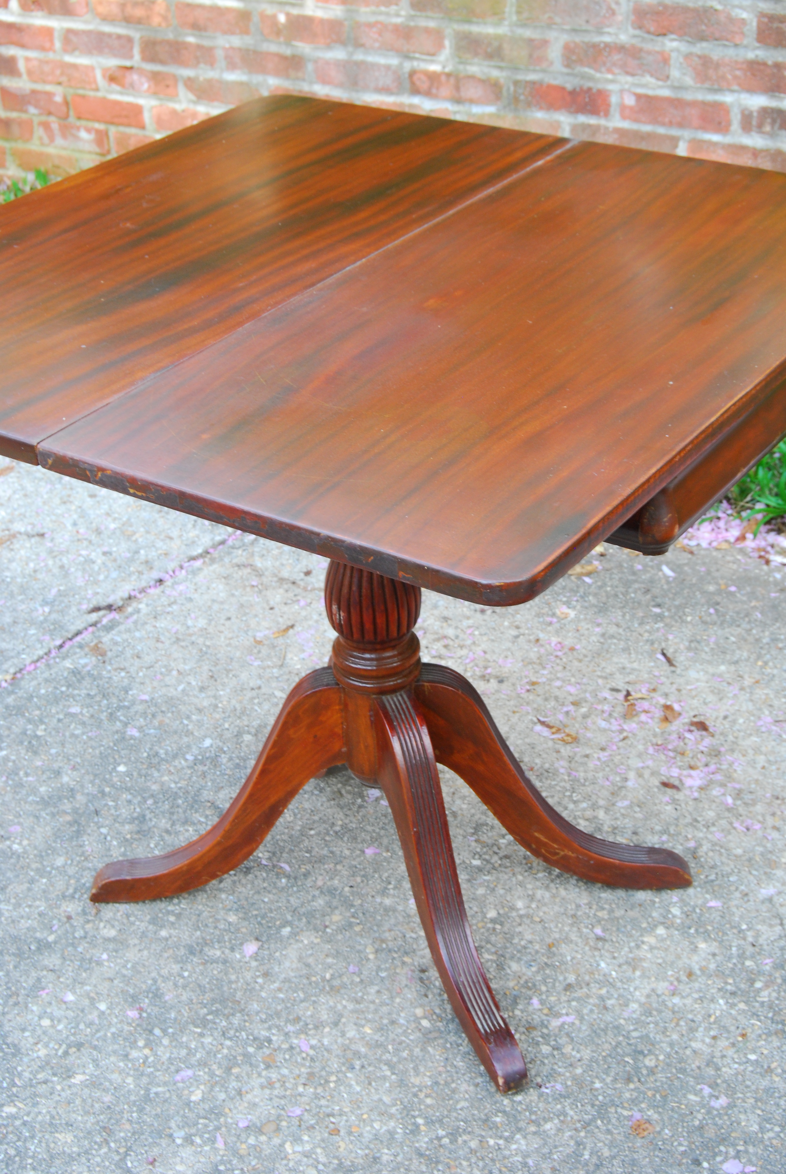 Your table is in the "Federal Revival style", reproductions of original American federal furnishings made 1780-1830. most like this one date from the first quarter of the 20th century, but remain in production to this day. Not a big demand for them at present, at auction tables like these often sell for less than $100.00.