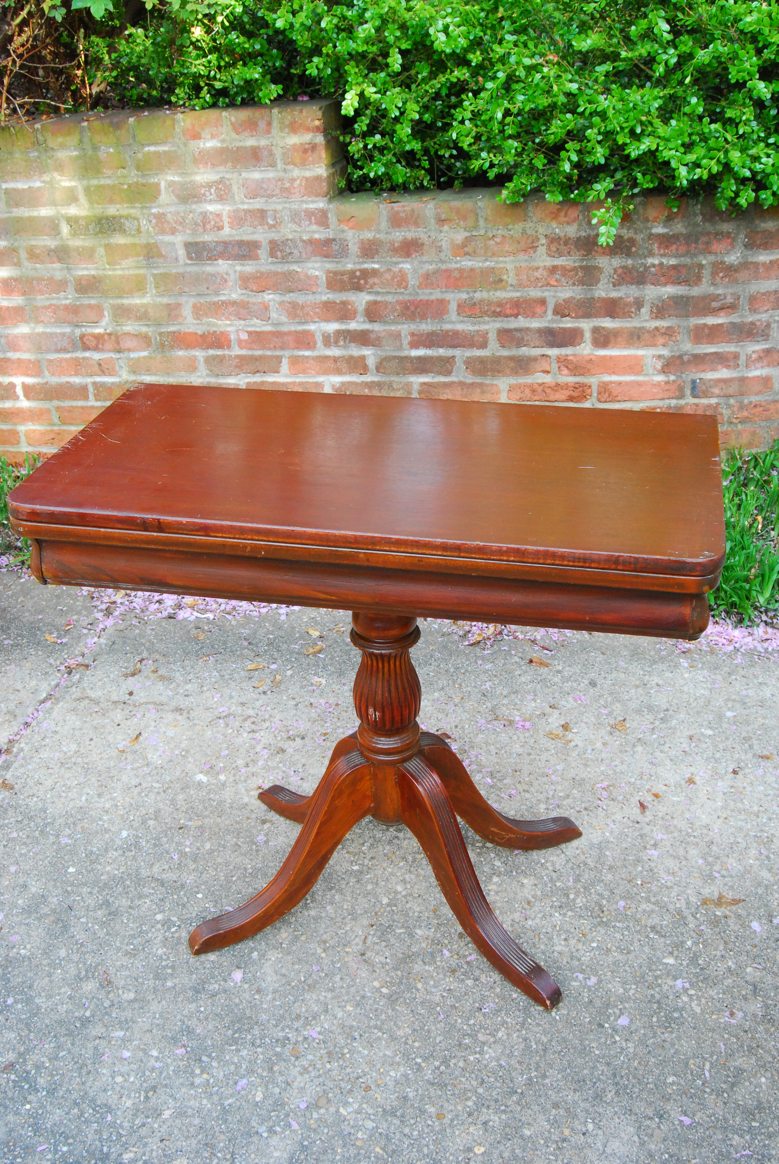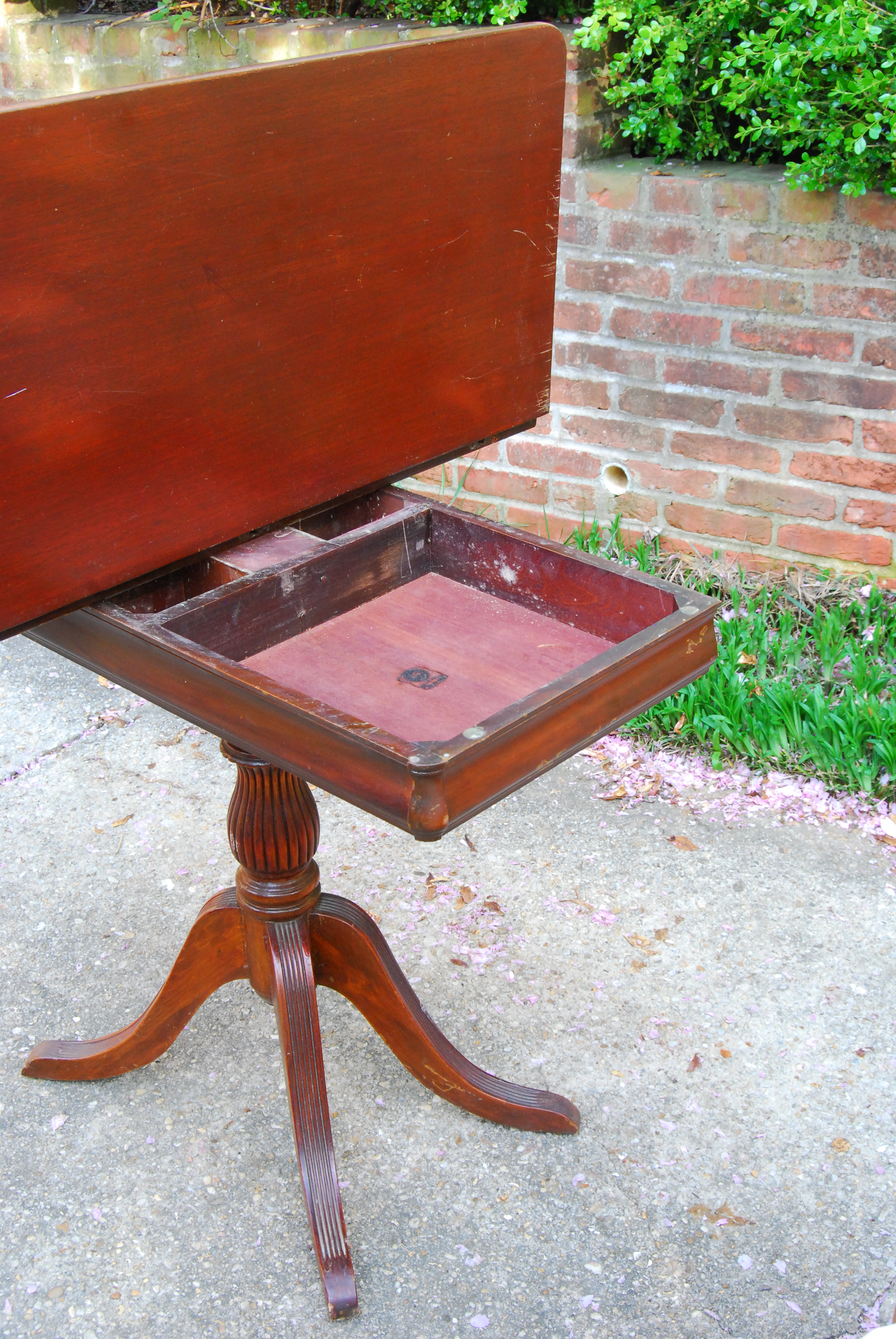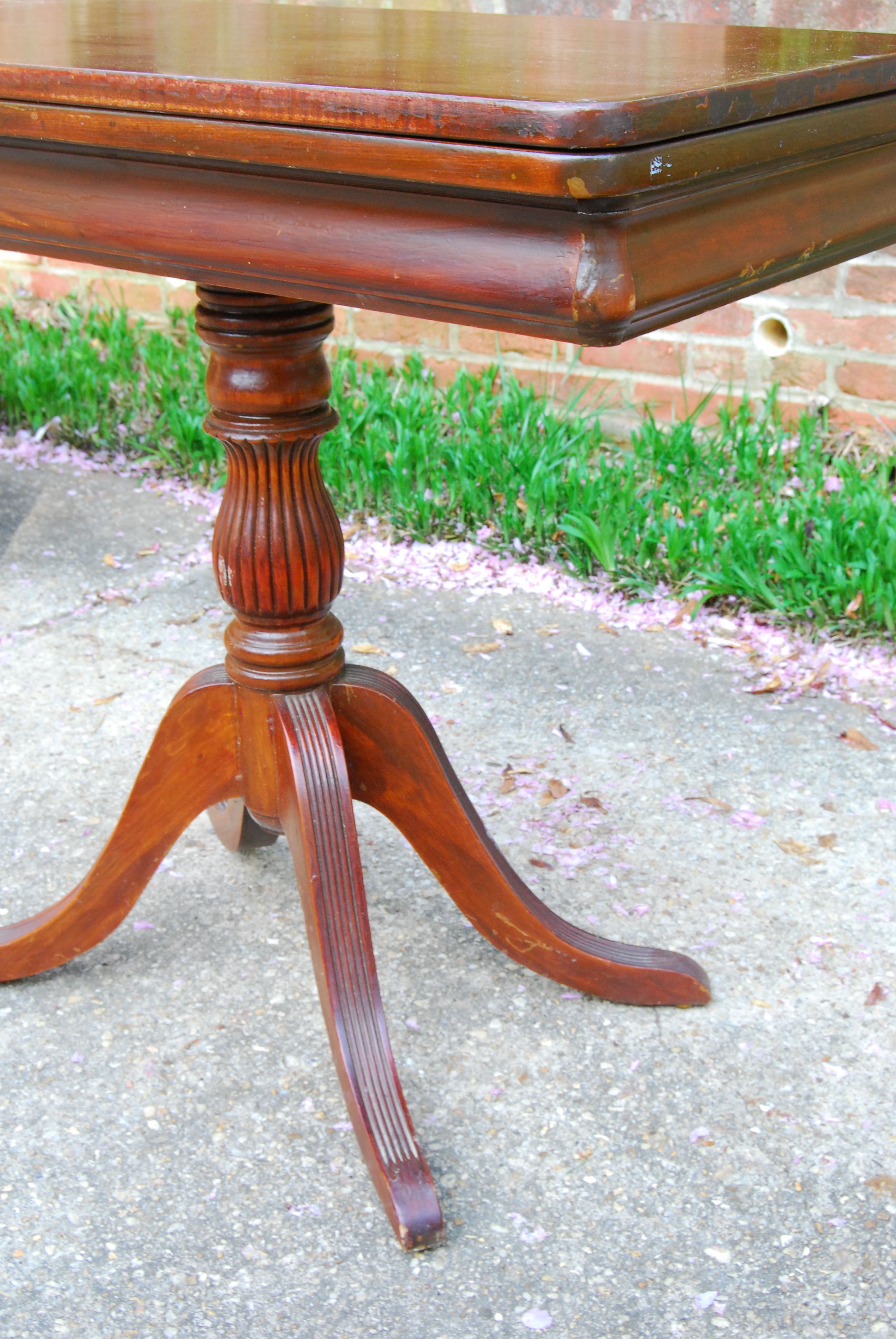 Your table is in the "Federal Revival style", reproductions of original American federal furnishings made 1780-1830. most like this one date from the first quarter of the 20th century, but remain in production to this day. Not a big demand for them at present, at auction tables like these often sell for less than $100.00.