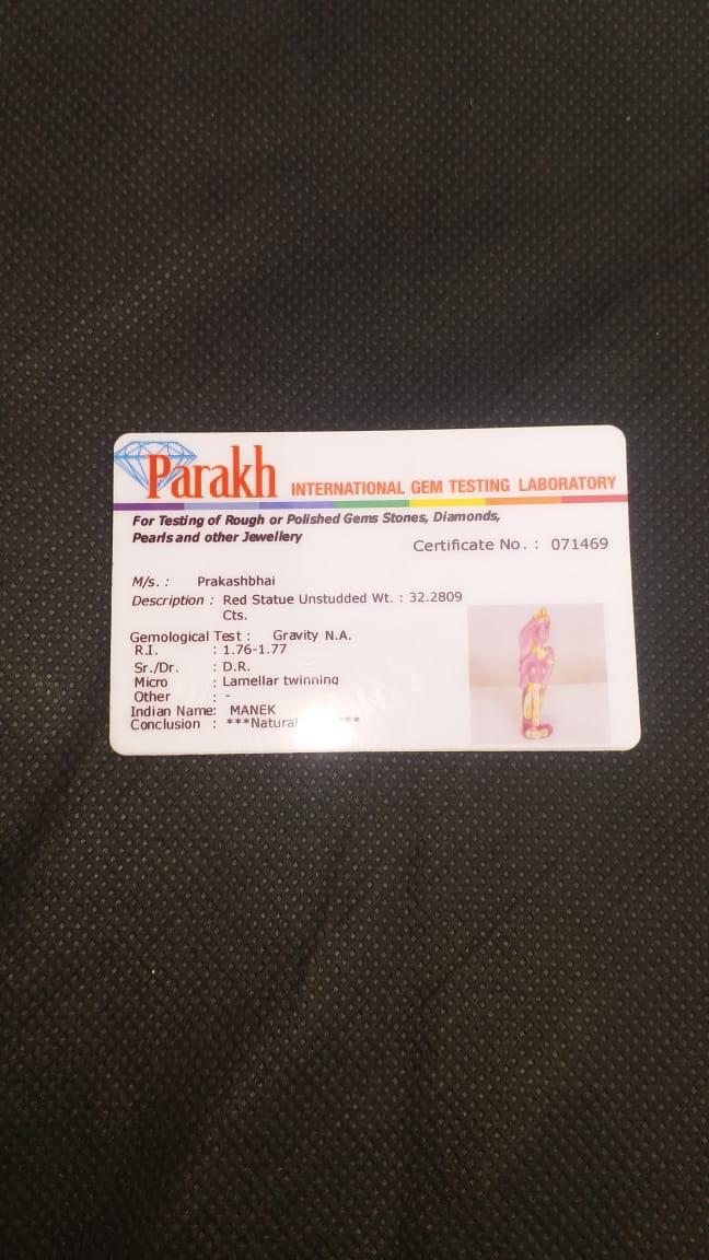 Red Manek Statue. Made by Parakh International Gem Testing Laboratory. Materials: Natural stone (Manek). Estimated value: $80 – $150. Condition: Excellent. The market for decorative stones is stable with moderate demand.