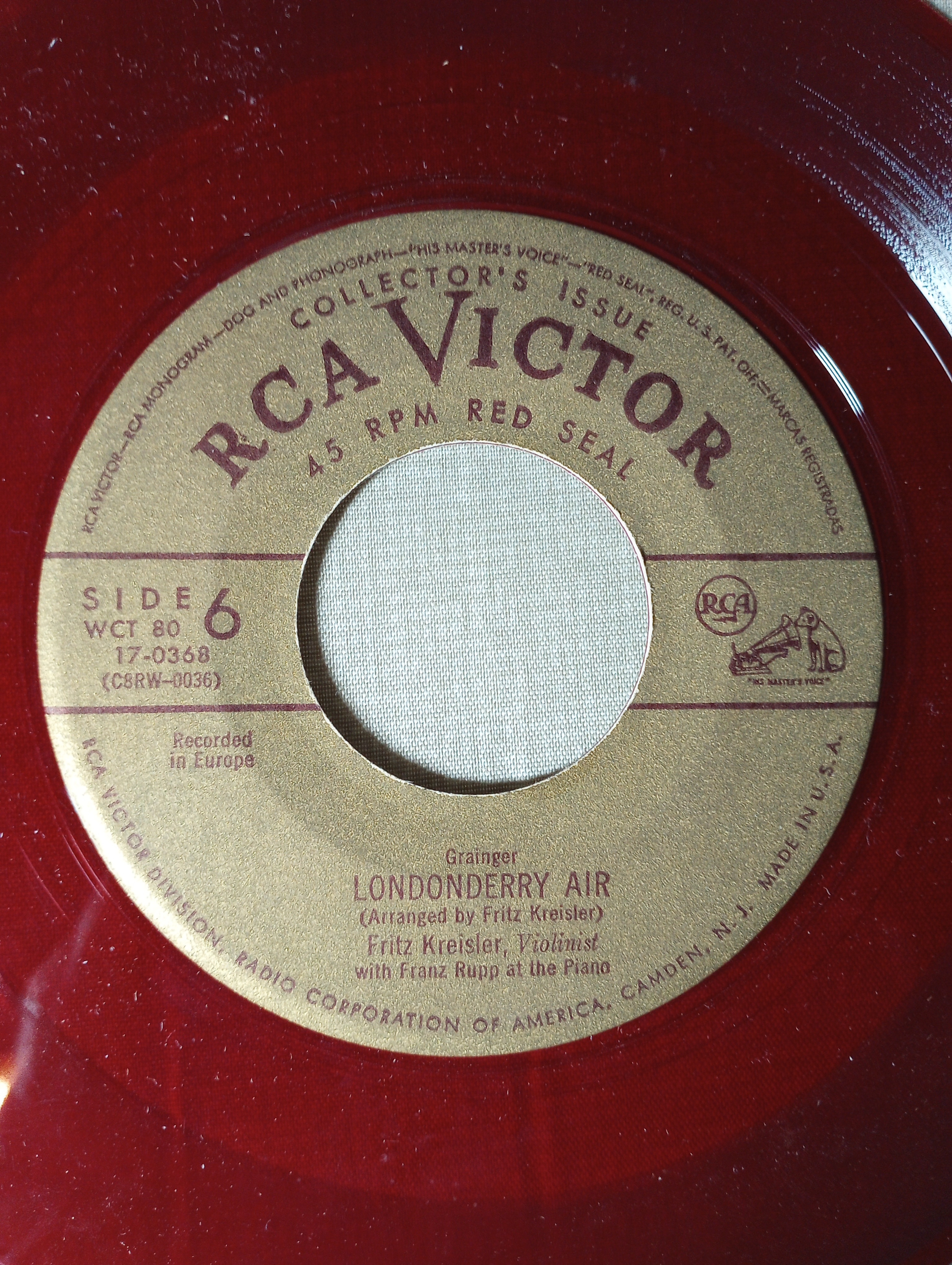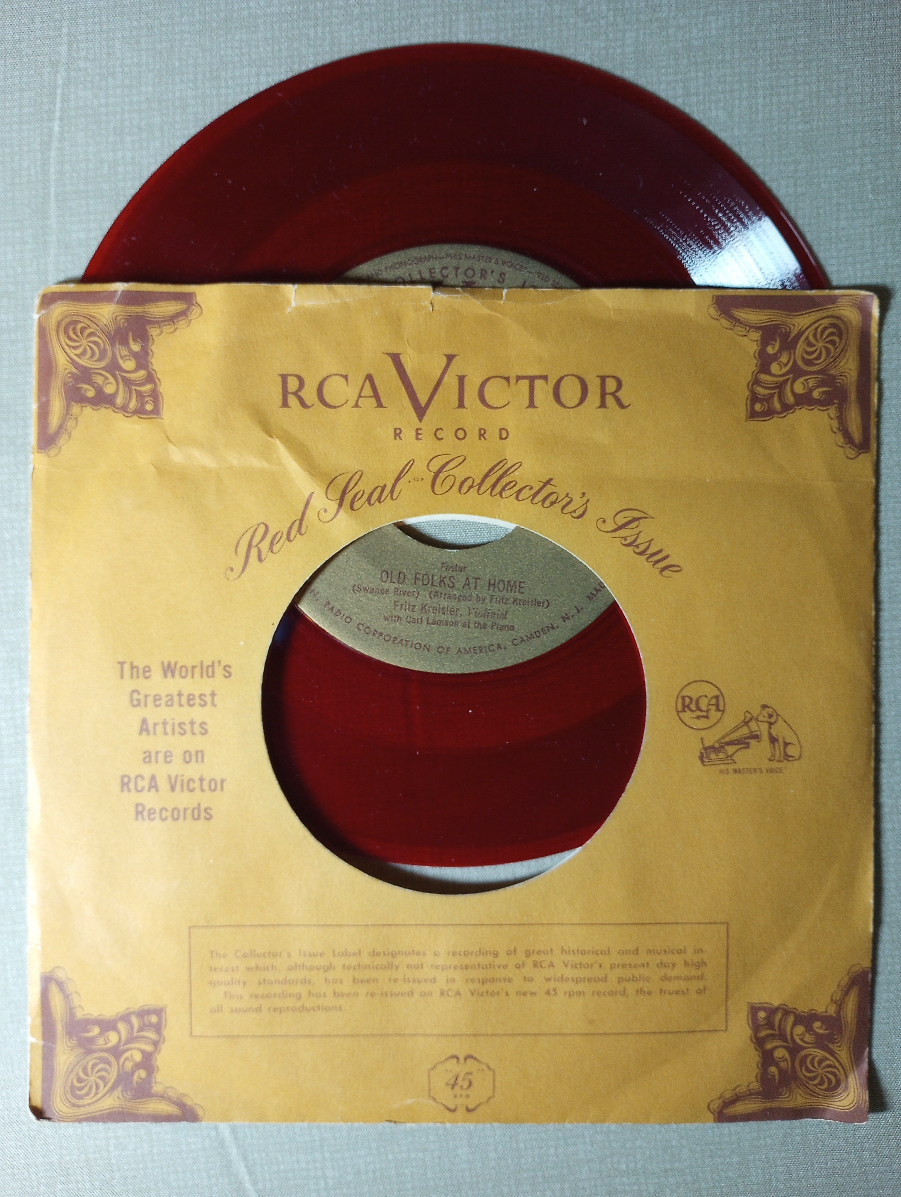This item is a vintage RCA Victor Red Seal Collector’s Issue 45 RPM vinyl record pressed on distinctive translucent red vinyl. It features legendary Austrian-American violinist Fritz Kreisler with piano accompaniment by Carl Lamson and Franz Rupp, performing two pieces: