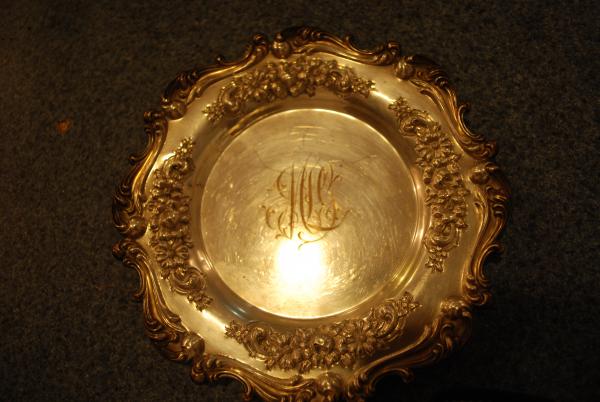 THis is a set of 9 matching silver plates. They carry the monogram MLG in the center. They are in excellent condition. They have a repousse floral pattern. The pattern number on the bottom is 3299C. Each plate is marked "sterling". Picture attached