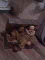 rednose clown emerging from what looks like a trunk