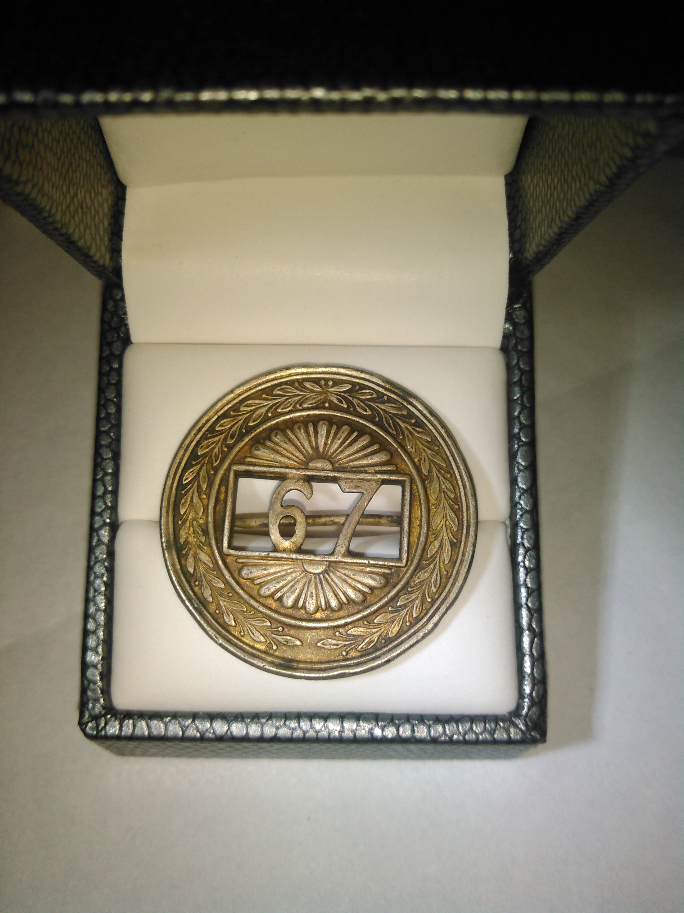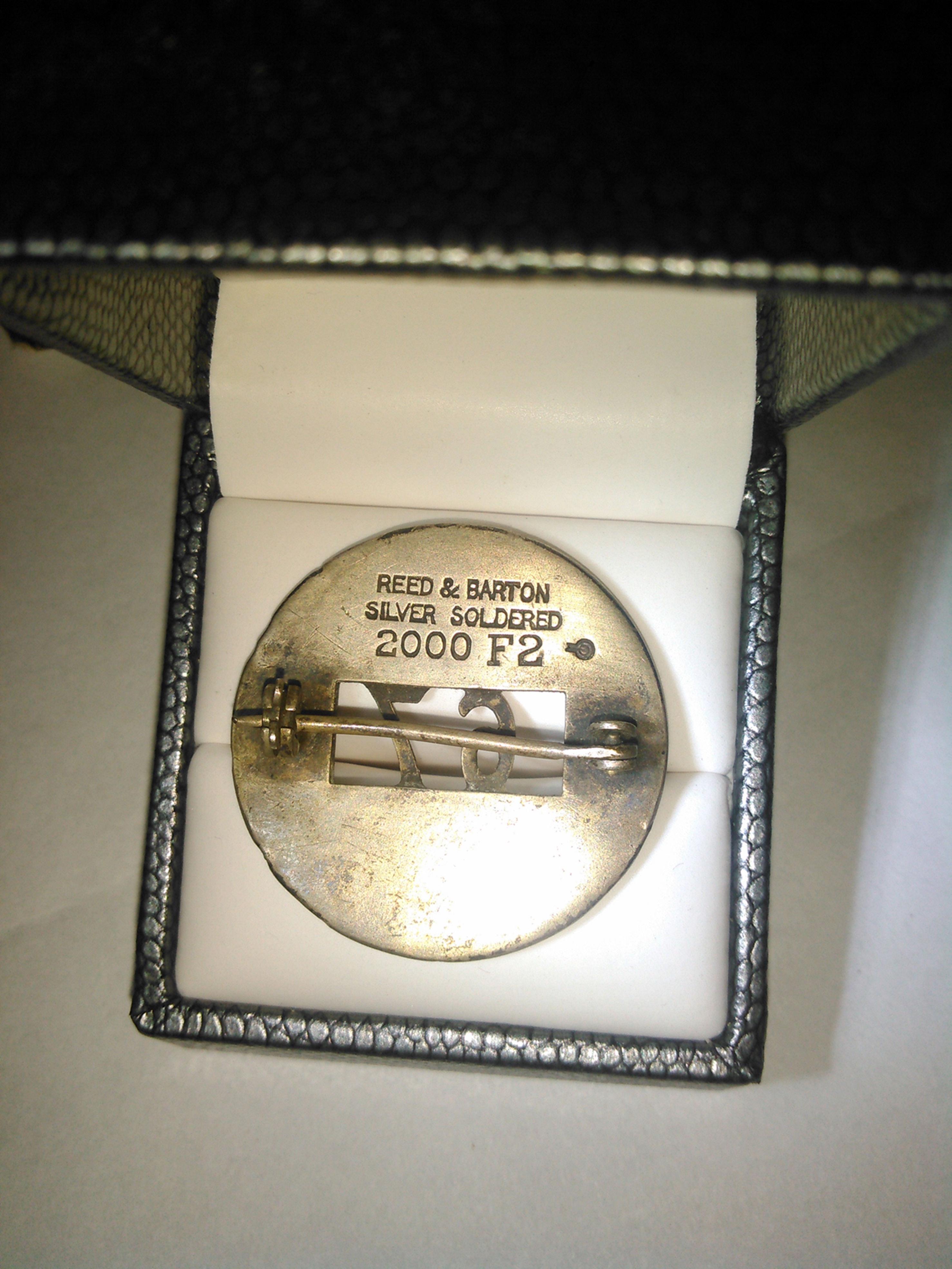 Reed & Barton laurel wreath pin. It has the number 67 in the center of it. The hallmark denotes it was made in 1936. Underneath the Reed & Barton stamp, it is stamped Sterling Soldered, and under that, 2000 F2. I have looked everywhere that I can think of, and have found nothing but the 1936 hallmark. I don't know if it is silver or plated, jewelry or military. This piece has me very curious. Anything anyone can tell me will be a great help. Thank you in advance.