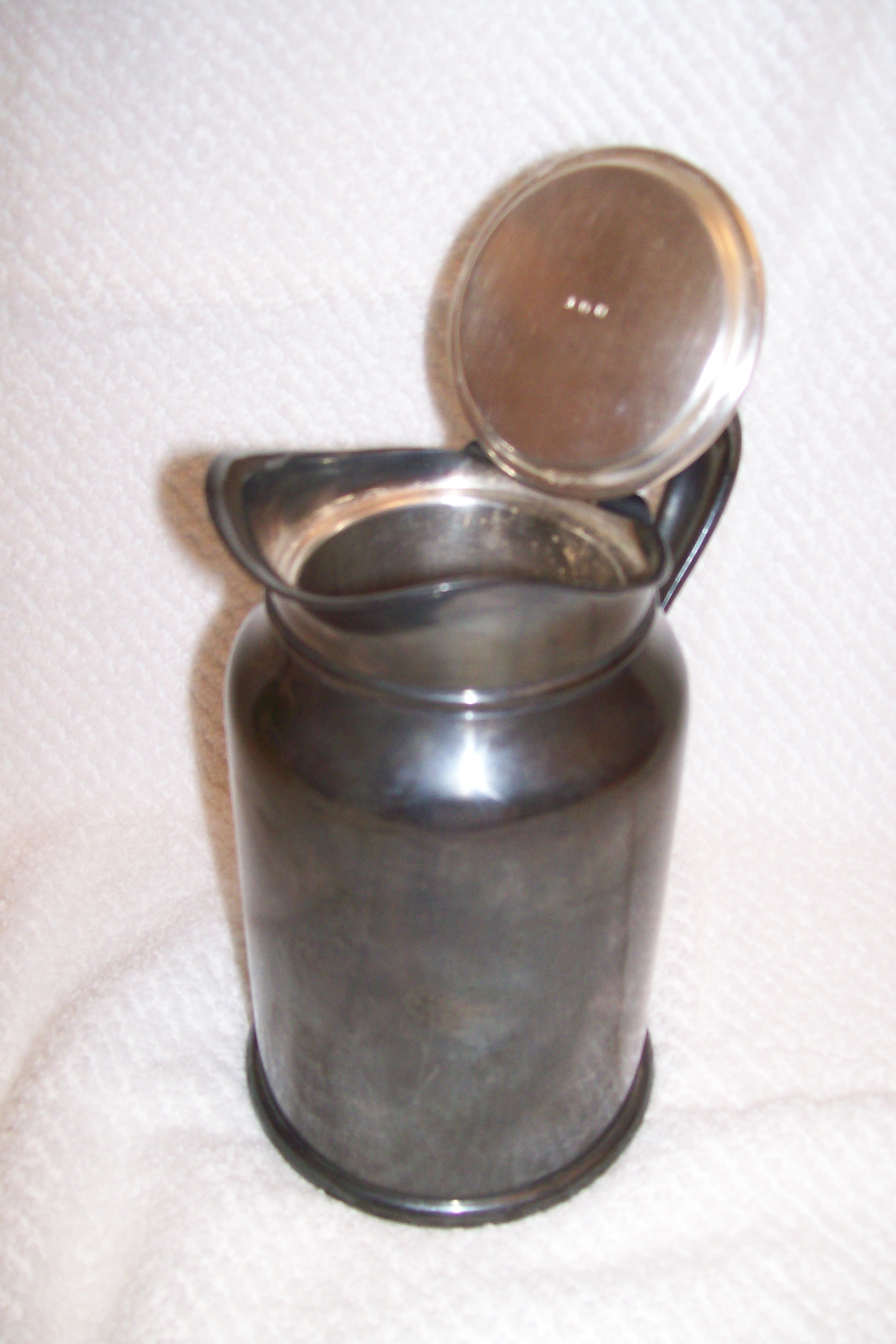 This pitcher is in excellent condition! No scratches, dings or signs of wear. It is heavy, insulated with a hinged top. It is in serious need of polishing, but other than that, it looks pretty awesome!
