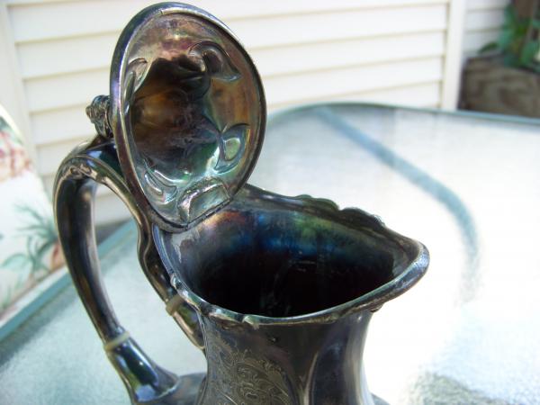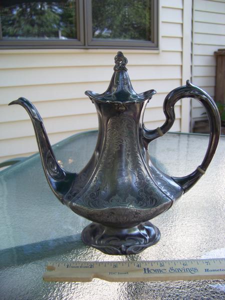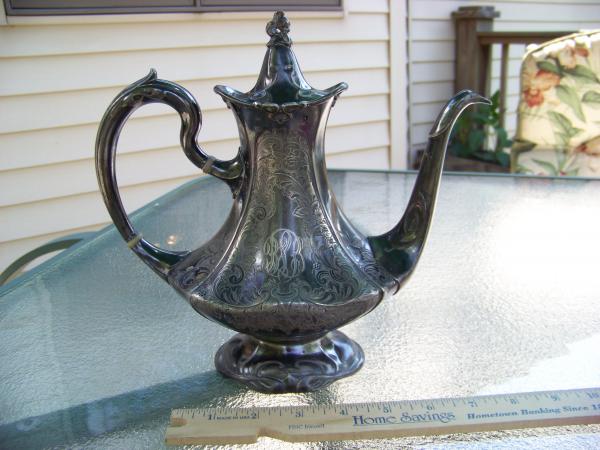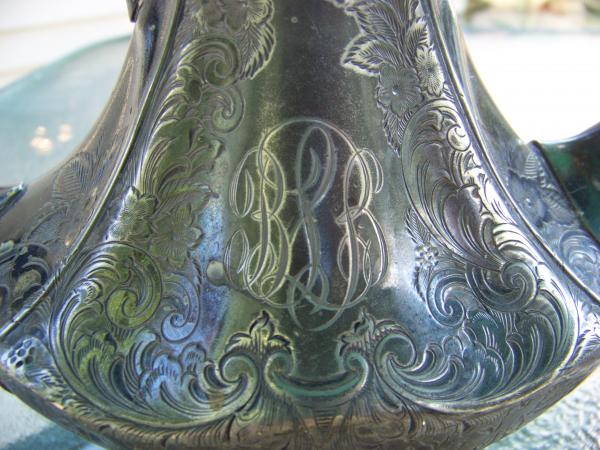 This Teapot is engraved with a floral and leaf design. It has a hinged lid. It also has a monogram of BLR. I'm having a hard time with that last letter. It does have a couple of dings in it. It needs a good polishing. The bottom read: M.F.D. & Plated By Reed & Barton 116 Patent Applied For.