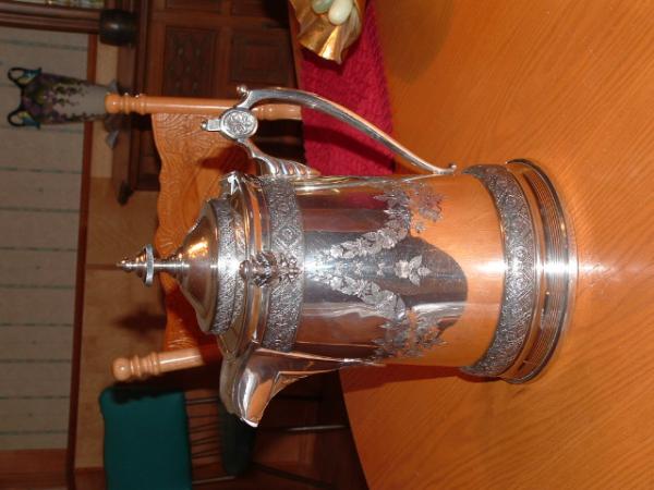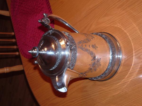 Silver plated Pitcher with intact porcelin liner. Flowered vines drape the exterior. Hinged lid.
