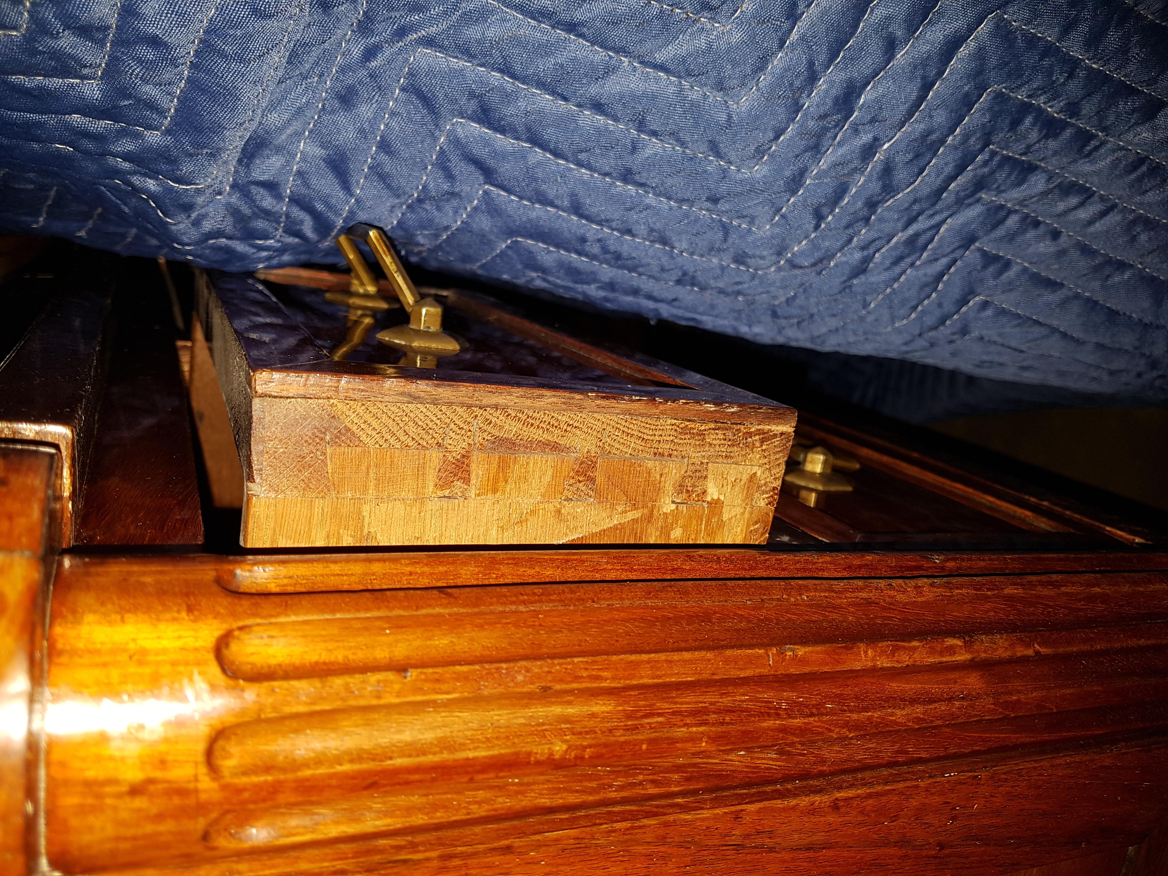 Can anyone tell from the pictures I have sent in this email what period this piece came from? Also, it came with a marble top that was cracked in two places. I am having a new marble piece made exactly to the dimensions and specifications as the original. Is it a good idea to keep the original marble slab? Does anyone know what type of wood was used? It is very heavy. There is also some damage to the front left leg. I have the trim that fell off, but should I get this professionally restored. Is it worth the cost to do this?