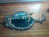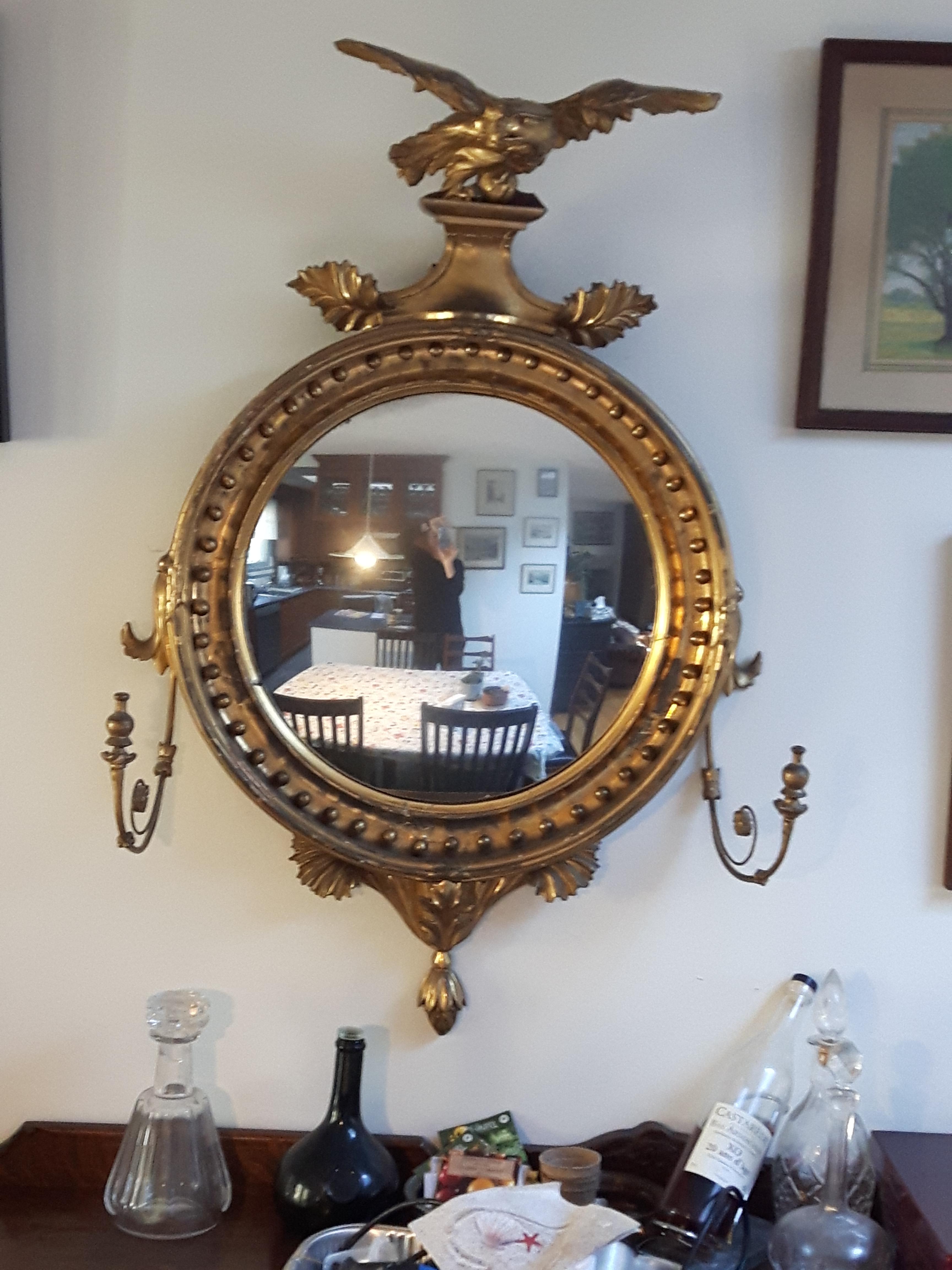 Open winged eagles mounted on a the top. Candle arms or girondoles attached to the sides of the frame. The outer molded border is surrounded by gilded, applied ball ornaments.
