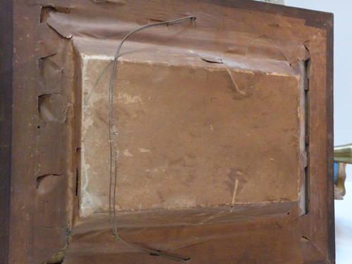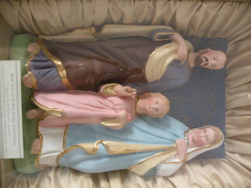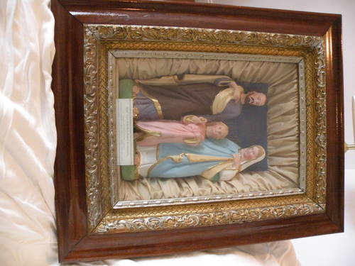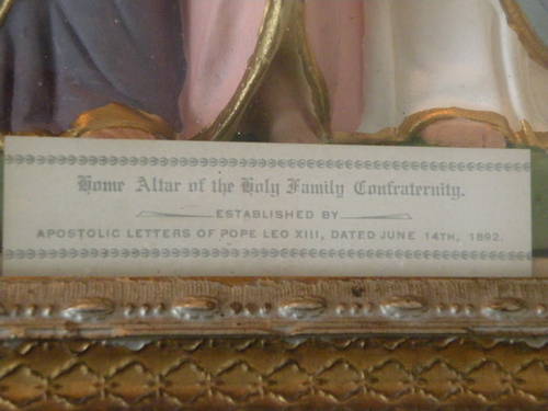 A very rare antique hand carved wood frame, 119 years old in very good condition. –features porcelain china figures of young Jesus, Joseph and Mary behind glass. Insert reads “Altar of the Holy Family Confraternity Established by Apostolic Letters of Pope Leo XIII Dated June 14th 1892." Measures 12½ inches high, 9½ inches wide, 4 inches deep. Original backing.