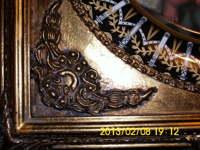The frame is very ornate, made of wood, gold and black coloring still very strong, never cleaned.
