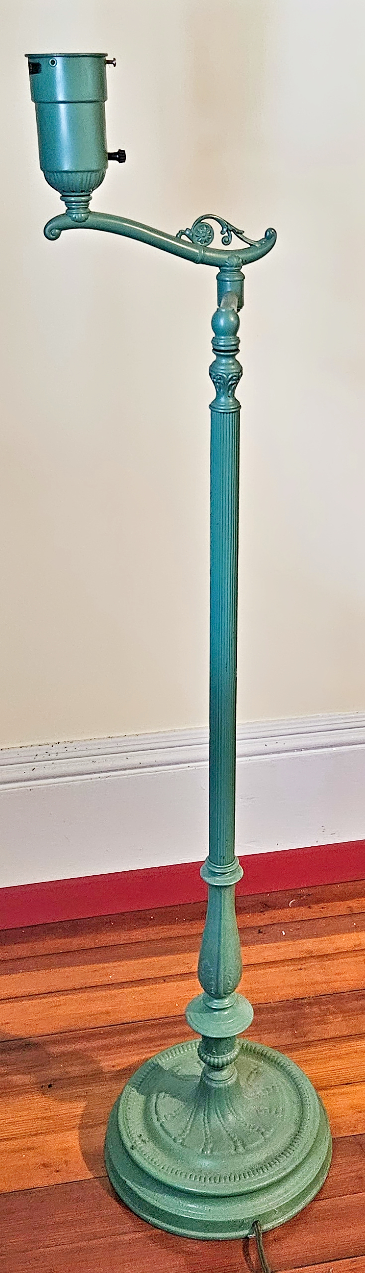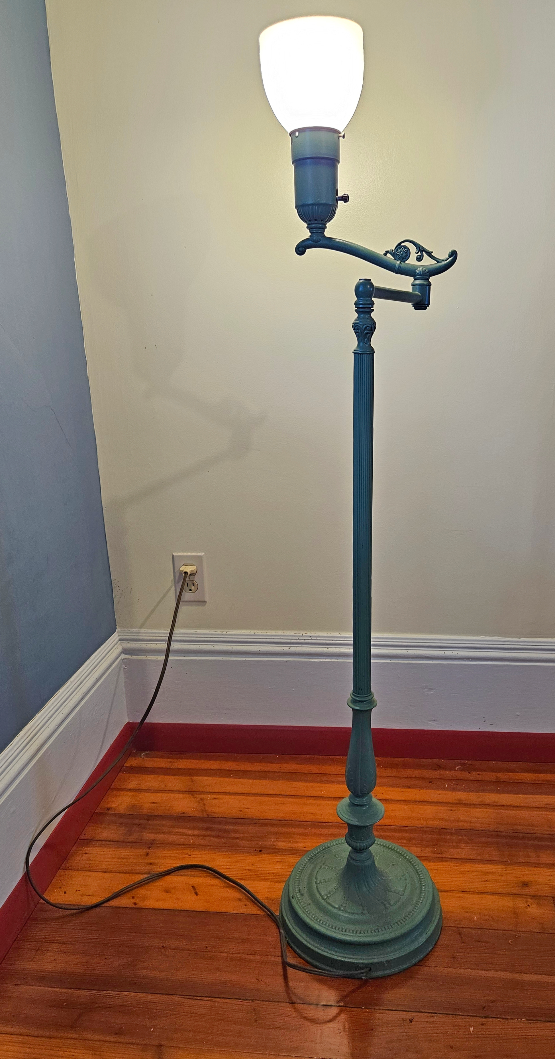 Very heavy (iron?) Rembrandt Floor Lamp in a turquoise blue with an arm that swivels out. Been in the family longer than 50 years. It works, though it might have been rewired. Unfortunately I broke the original shade last night :(