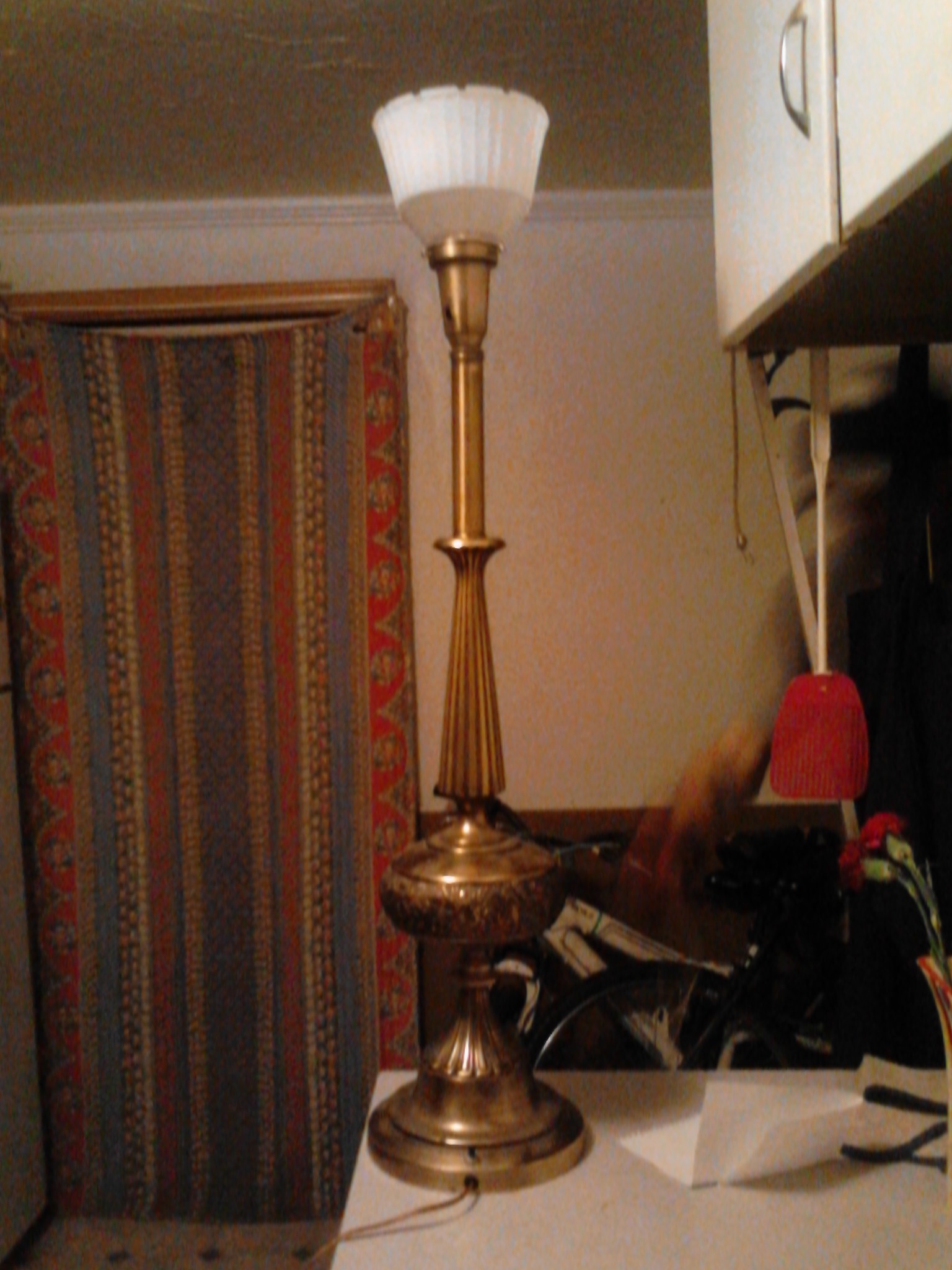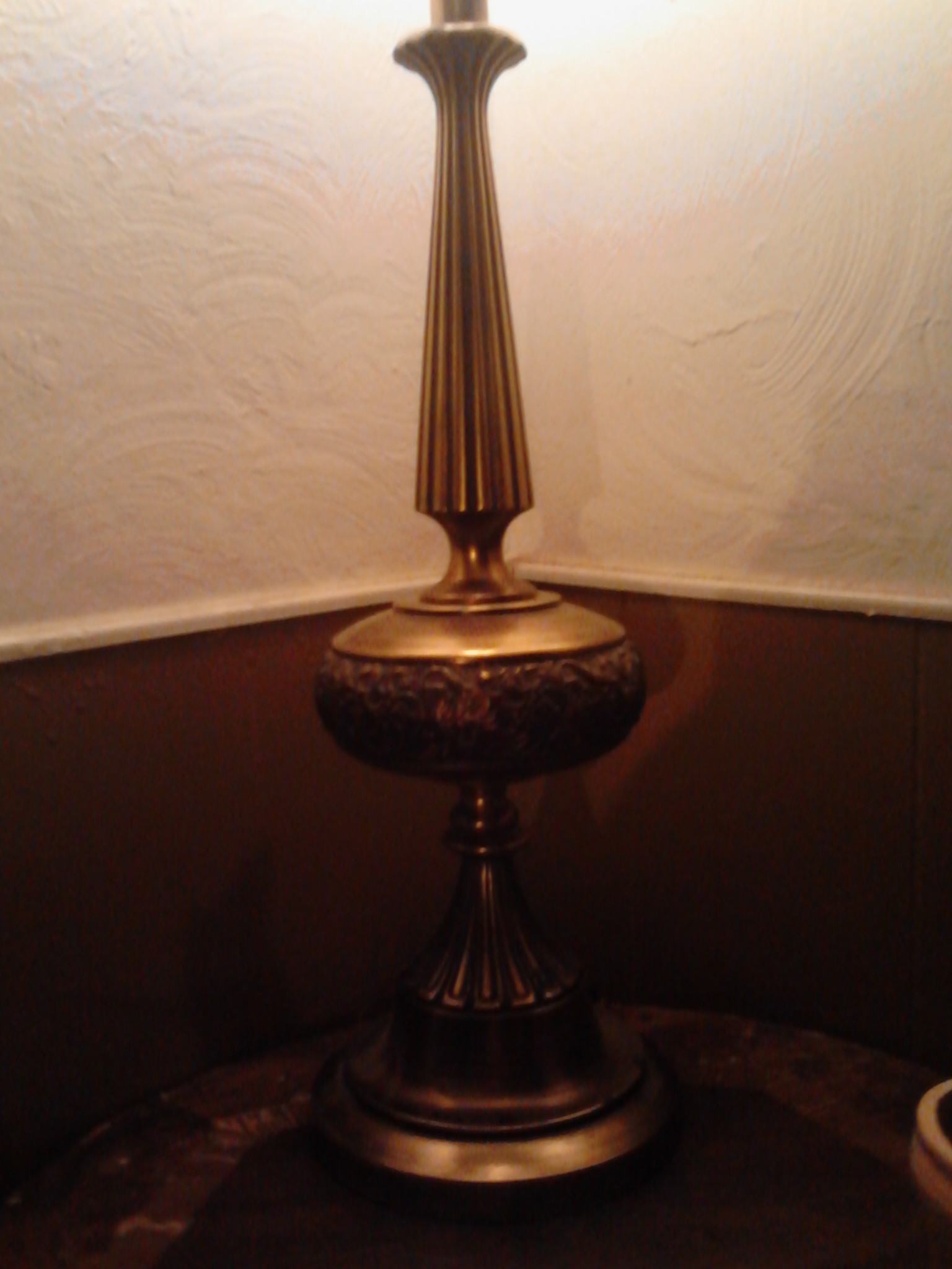 It is a brass baluster style table lamp. It weighs 15-20 pounds. It's the original finish in good condition it works great, there is just a little bit of wear on the "Rembrandt Lamps" label so you're unable to see the word "masterpiece." I believe it's from the 1950's but I'm not too sure. There's 2 switches, one near the top and one on the base.