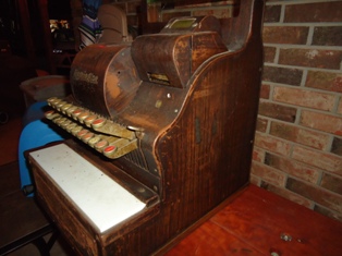 Cash Register, Heavy Metel painted "wood like"...missing a key (Lock key ) drawer works, and bell, and amount keys work...has a reciept roll holder, date stamp...it also has a couple small windows, I can't tell what is supposed to be seen there.but covers open on them. Two glass plates cover top and customer side of $ amount of sale window...the store clerk side is missing....