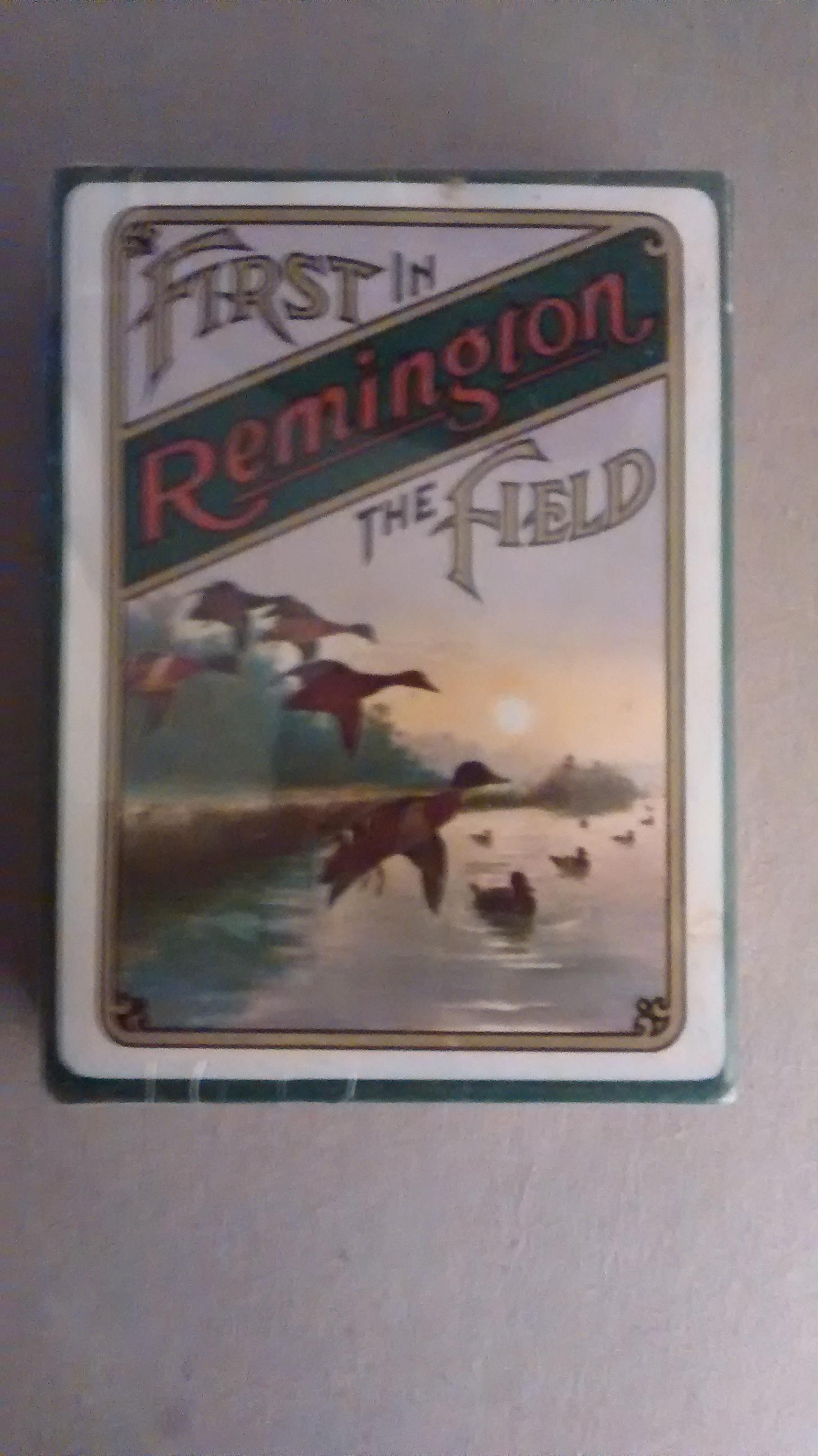 This is a unopened deck of cards with a Remington guns manufaturer picture and logo on the front. Also, it says "Remington Arms" on the sides.