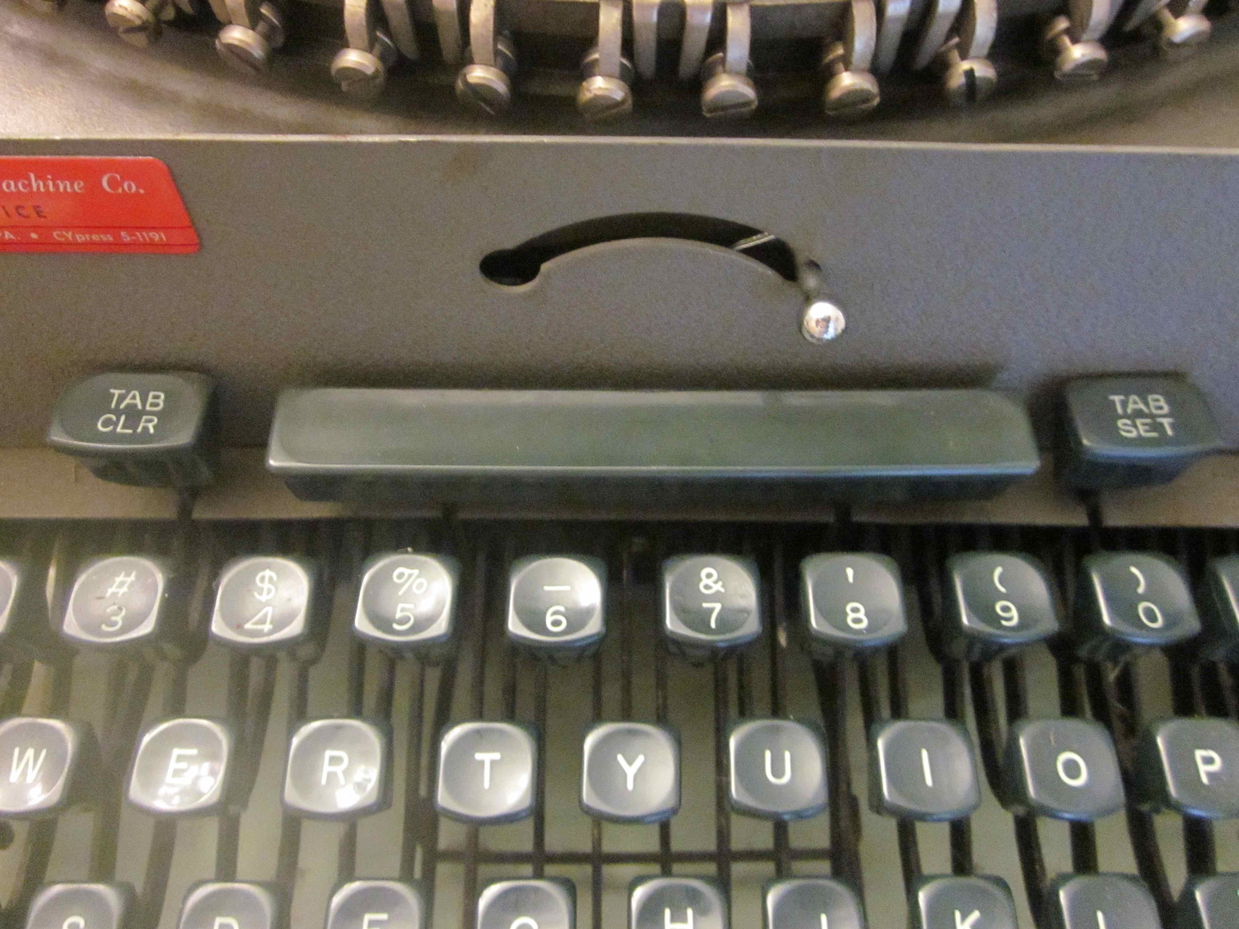 Extremely heavy, thrust-action Remington Rand "quiet-writer" typewriter. Unusual short advance bar in front above keys; atypical green, plastic square keys (not encircled); high support behind platen; unusual metal clip on center of top above typebars; ribbon is loose and winds on spool attached to typewriter. Tag on front says Penn Jersey Business Machine Company, Morrisville, PA (no zipcode). Unable to locate serial number or model number. Back has writing that says "Remington Rand" and something that is illegible, behind platen has writing that is worn off. Similar to Remington Rand Superwriter, but some features are different. Many small knobs and handles for adjustments, not sure what they do. Much too heavy to be portable, so no case.