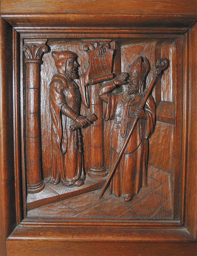 European Oak Cupboard attributed to the Rennaissance era. has four square doors with removable carved relief panel The decoration on the doors appear to be carvings of Monks or Priests This cupboard is a solid piece and is made of hard oak. Good to very good condition