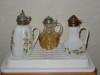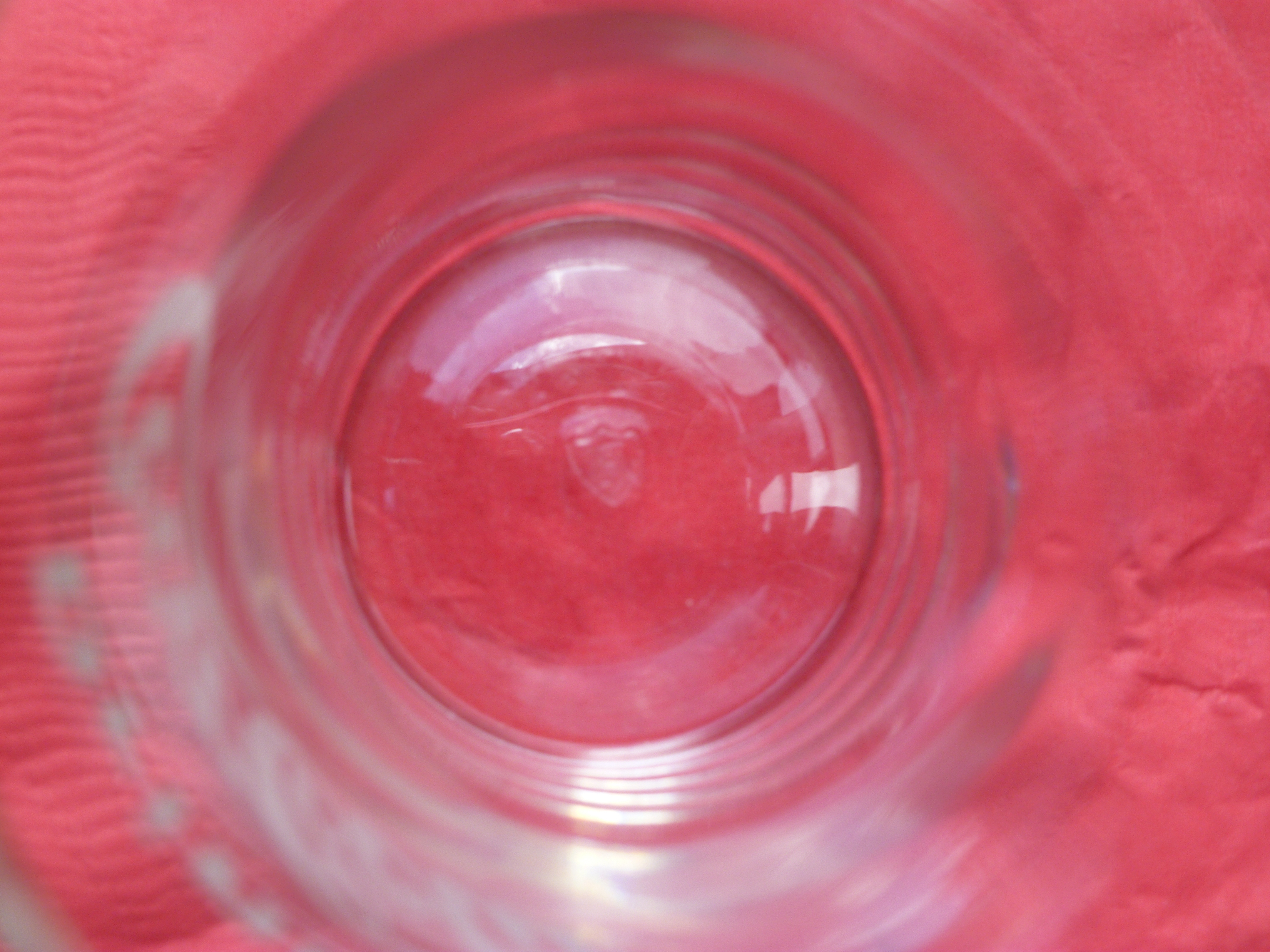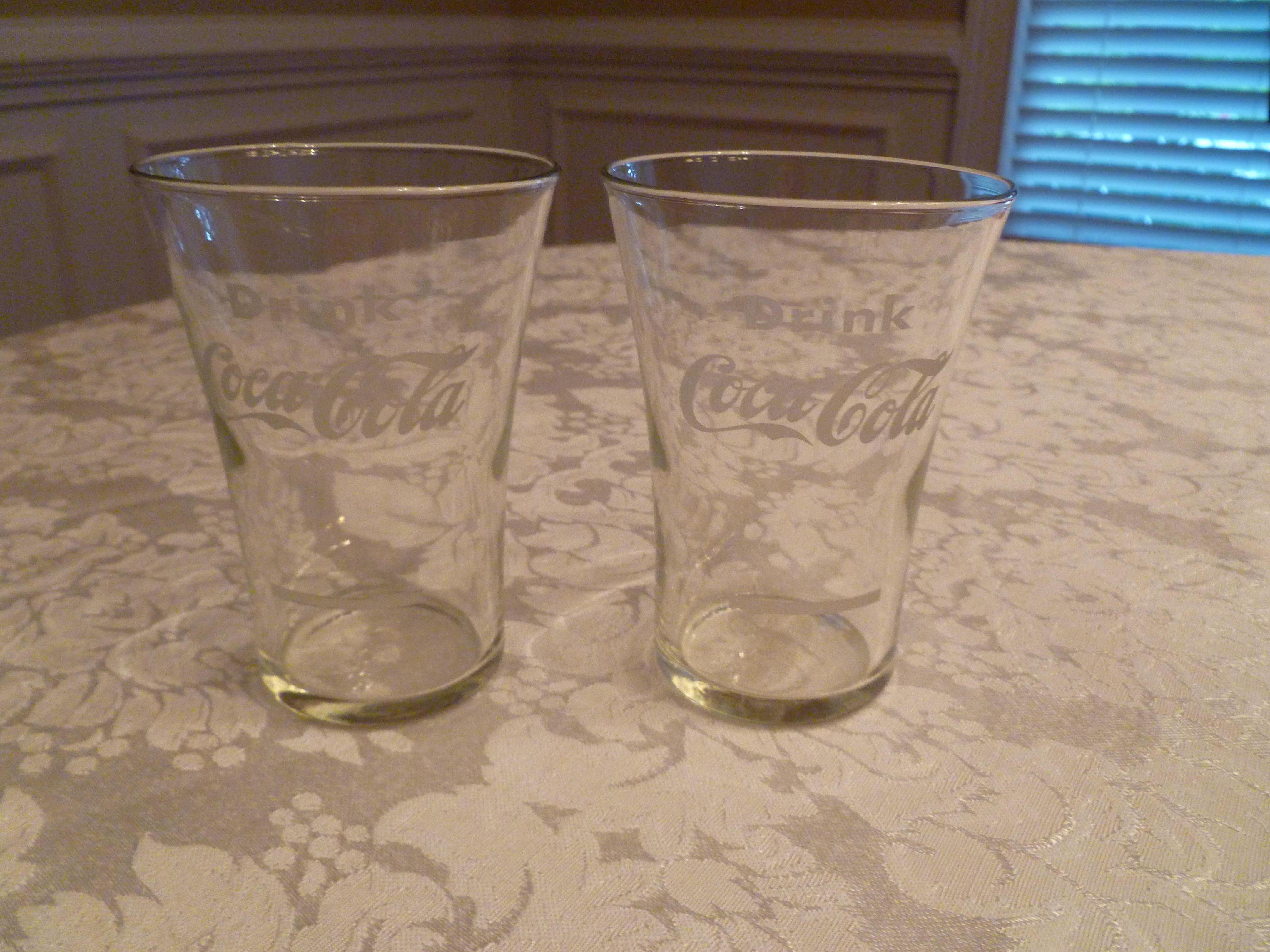 I have two Coca Cola Glasses. They are 3 7/8 inches high, with a 2 3/4 inch diameter at the top. The base has a diameter of 1 3/4 inches. The wording says "Drink Coca-Cola." There is also a syrup line about one inch from the bottom. The writing and syrup line are a greyish white (not bright white) and have a rough feel to them unlike the smooth painted bright white words I have on some other coke glasses. There is no writing on the back side of the glasses. There is a shield mark on the bottom. When viewed through the glass a capital "F" is visible. When viewed from the bottom, the "F" is backwards. I could not get a very good picture of the mark, but you can just barely see the shield in the last two pictures. The first is looking at the mark from the outside; and the last picture is a view looking into the glass at the shield. I understand that reproduction glasses like this were made in the 1970's or 80's. How can I tell if what I have is early 1900's or 1970's or 80's? These are in excellent condition with no chips, cracks, etc. Thanks so much for any help on this.