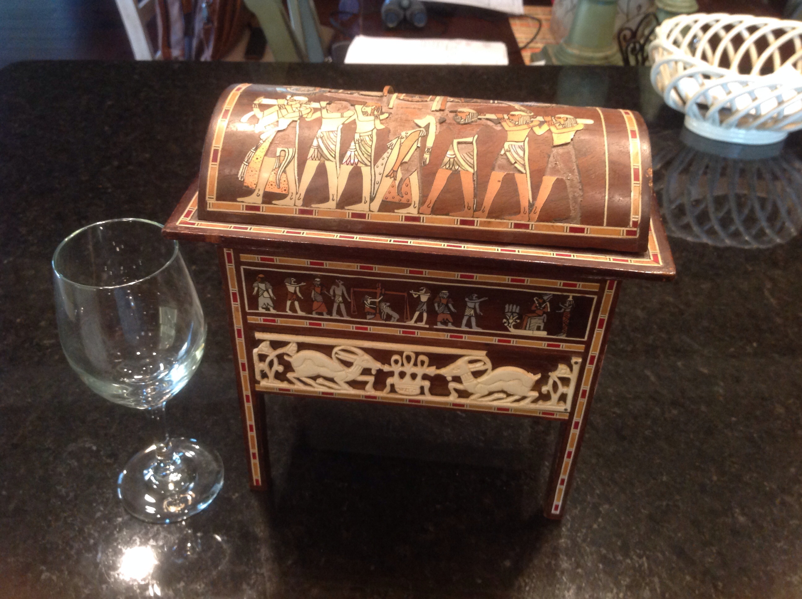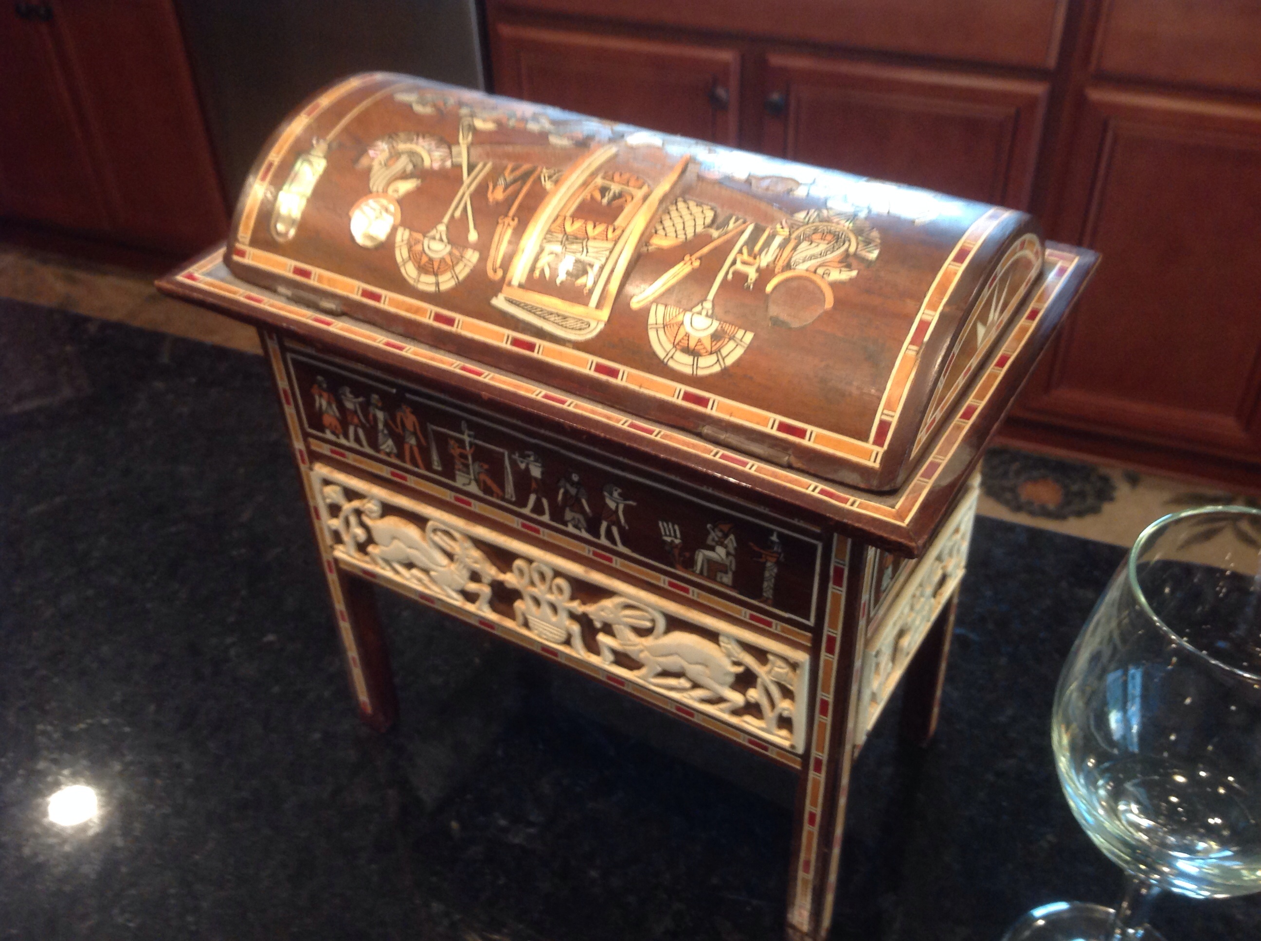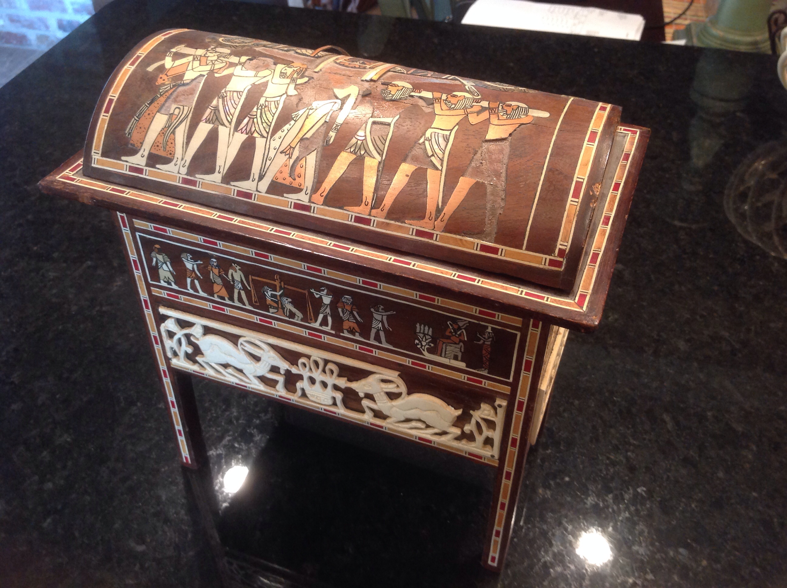 It has mother of pearl and some type of bone appliqué with the Anhk symbol.  The appliqué is nailed to the box.  It's about 12" tall x 12" wide and 8 " deep.
