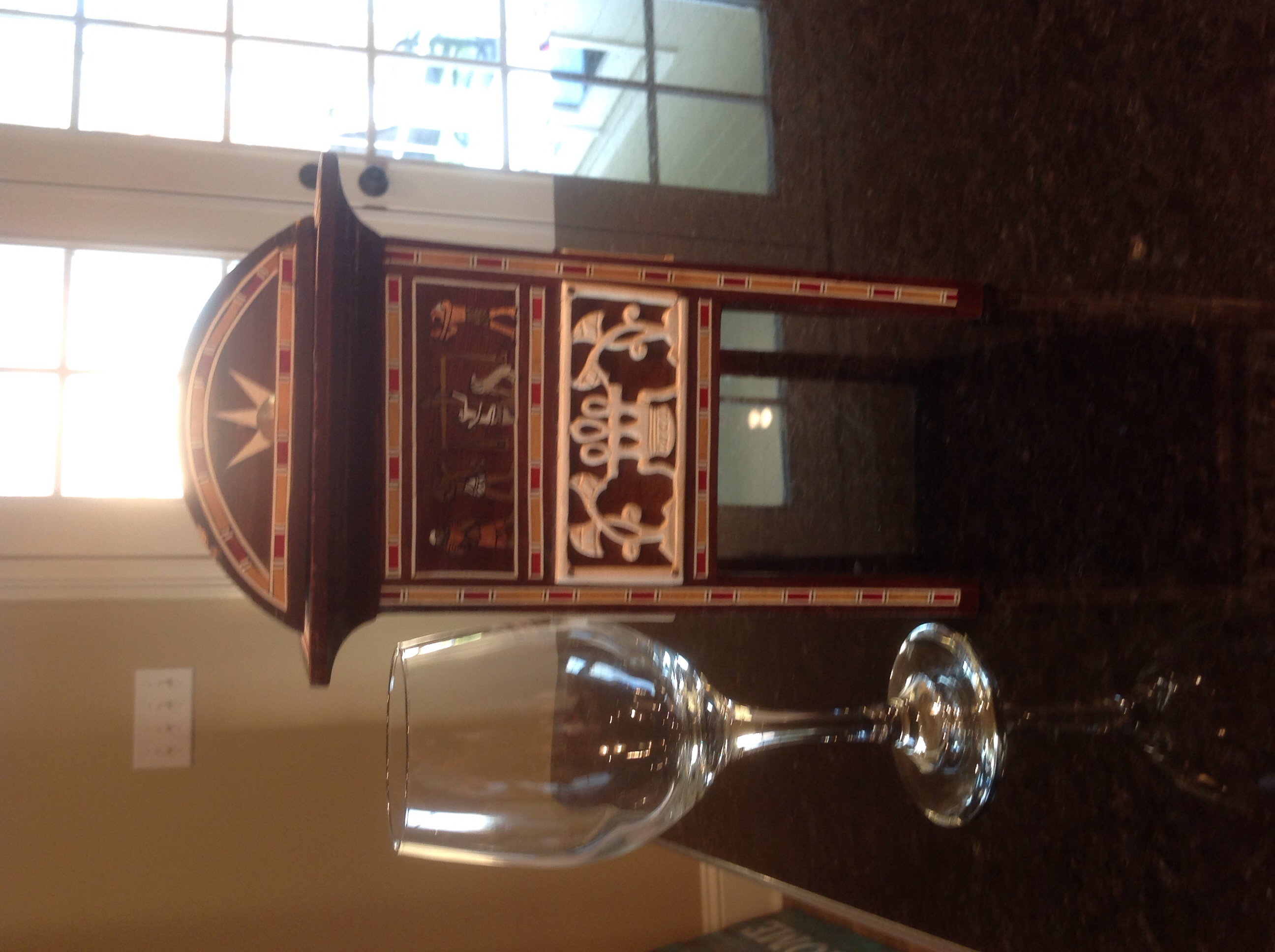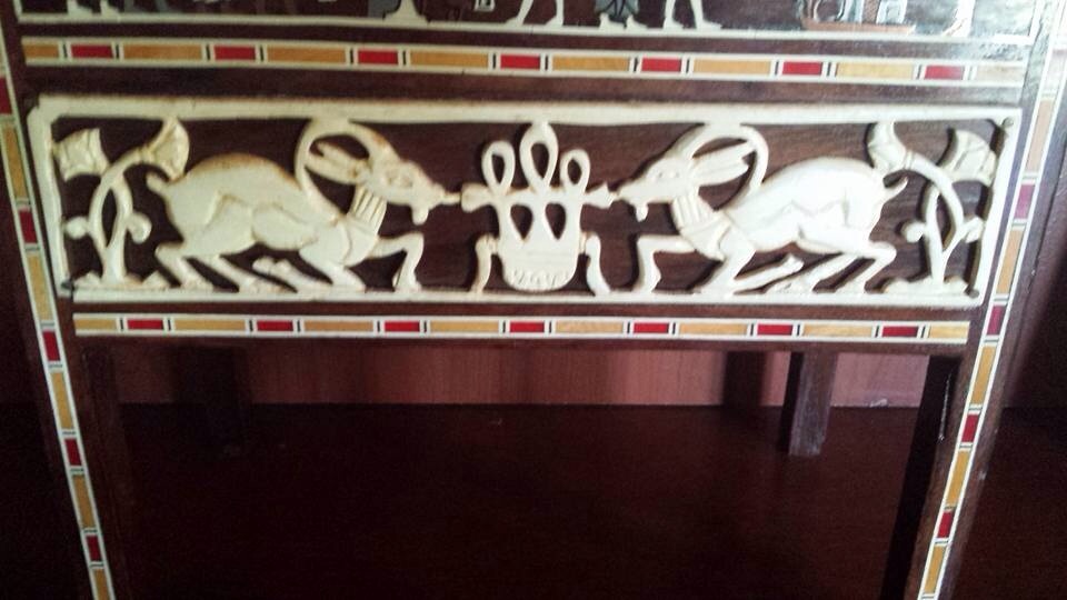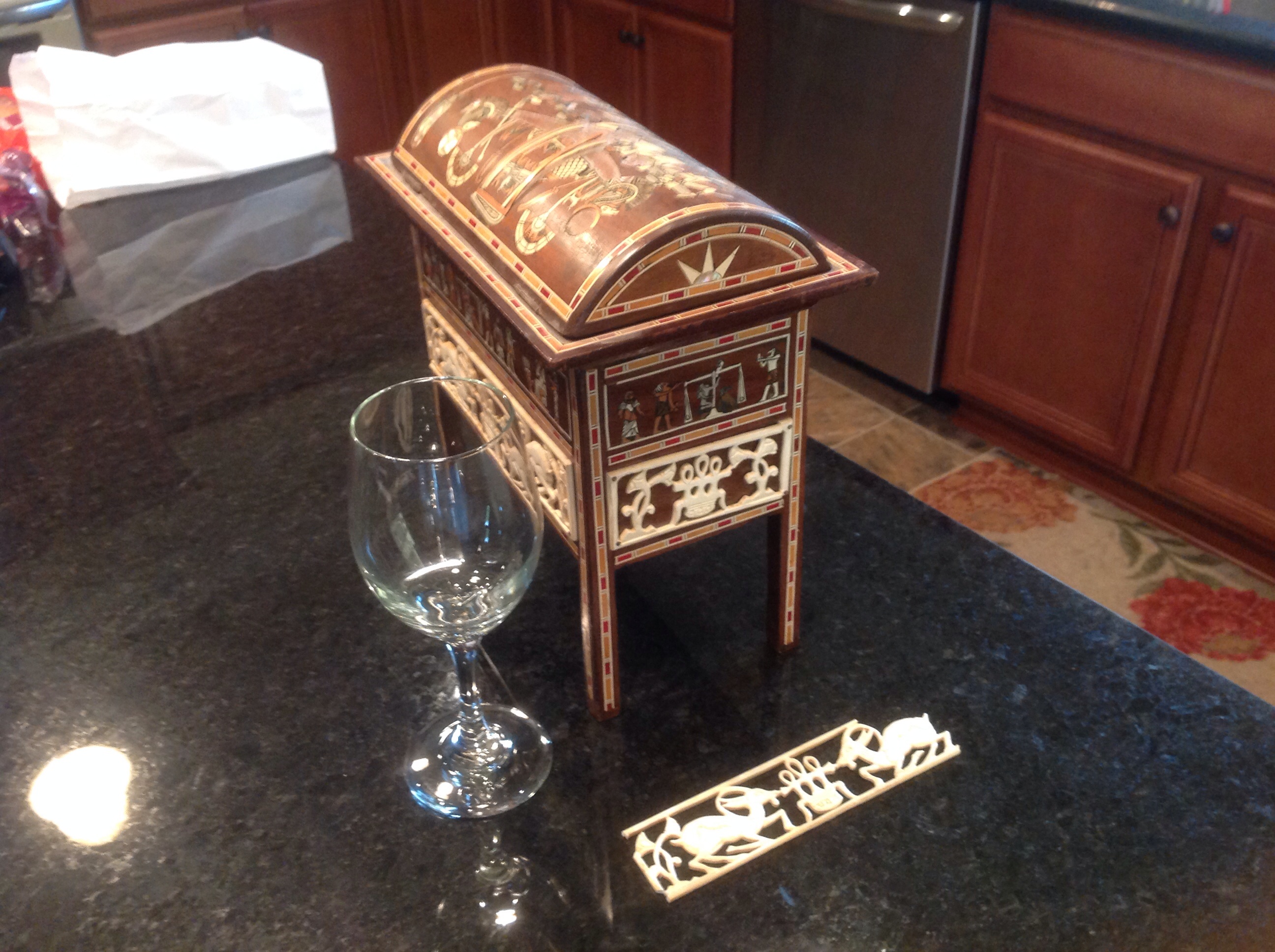 It has mother of pearl and some type of bone appliqué with the Anhk symbol.  The appliqué is nailed to the box.  It's about 12" tall x 12" wide and 8 " deep.