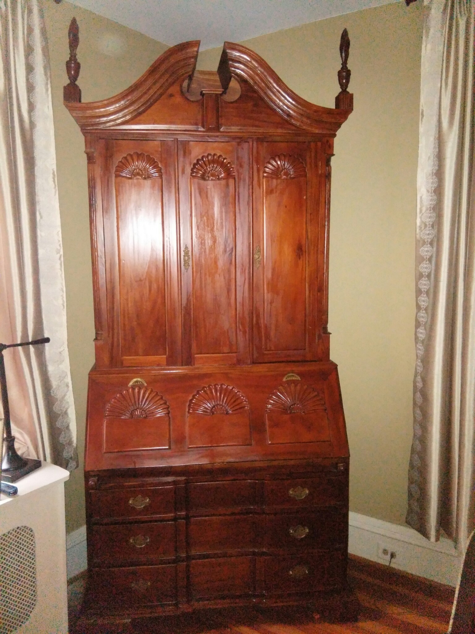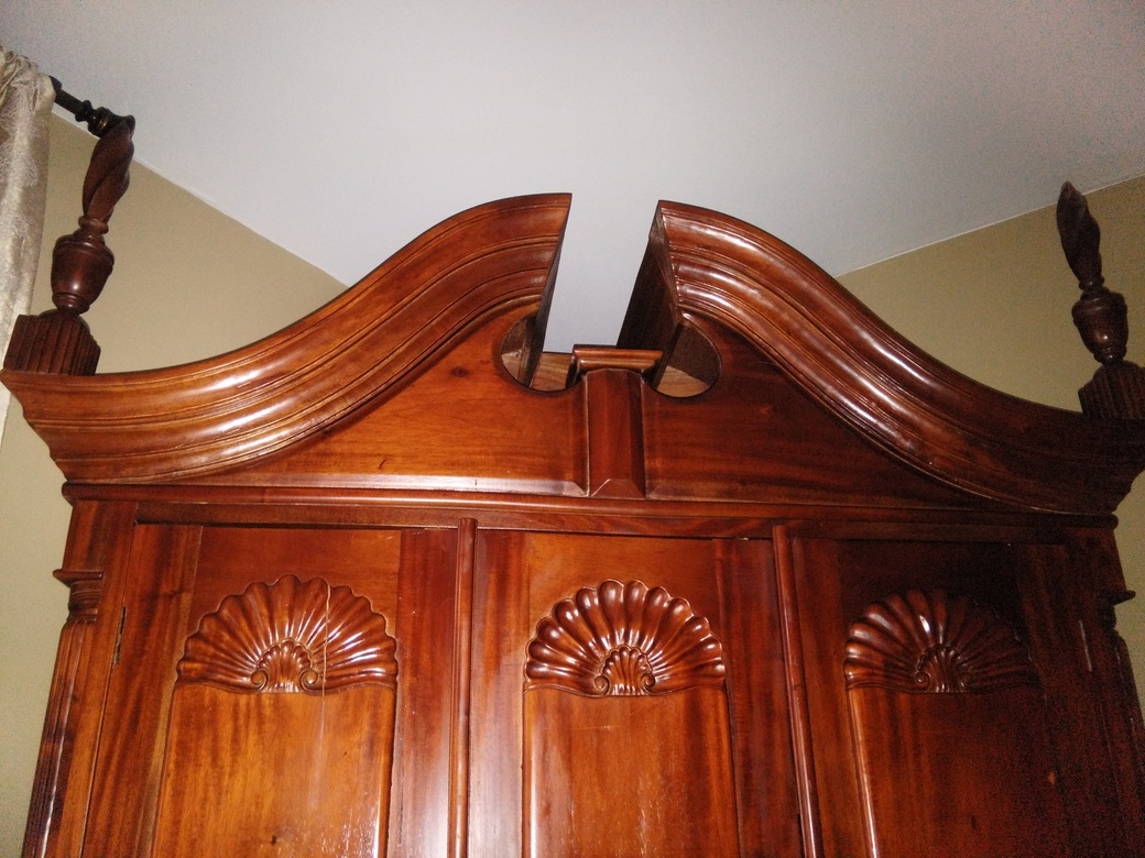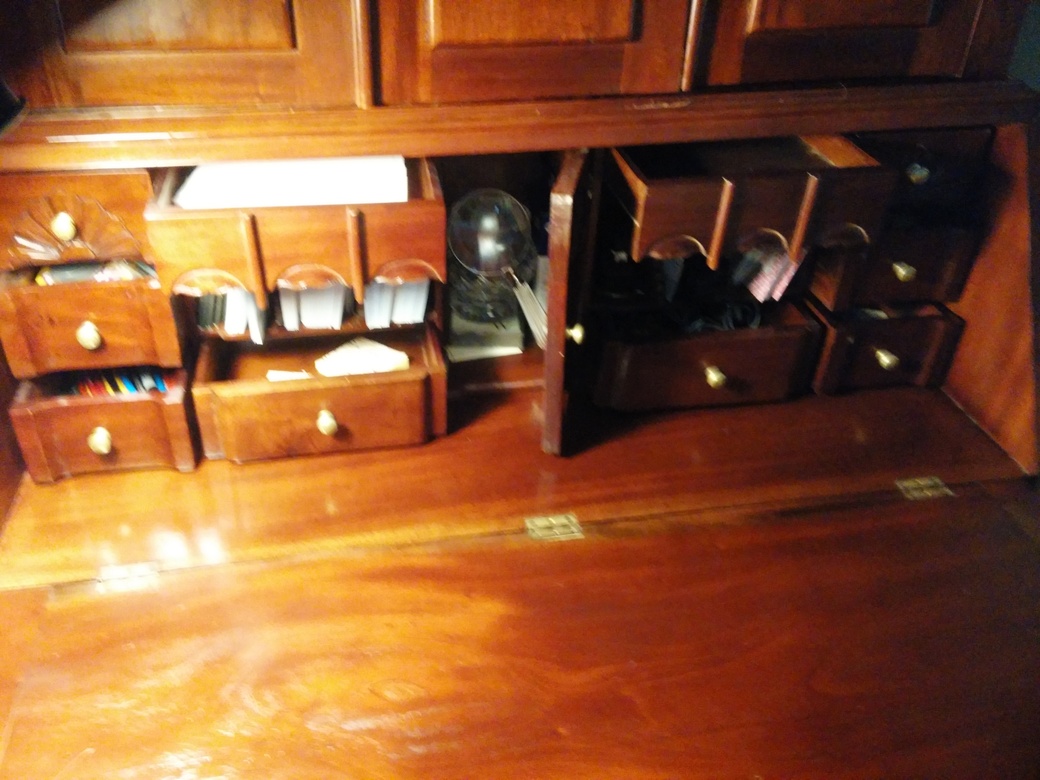 I am interested in selling this piece of furniture and have no idea of a fair-market price.  It measures 44"w x 25" d x 98" high (roughly).  It breaks down into two pieces.  There are two cracks which  are shown in the pictures.  I included a picture of the side of the drawer.  It is solid with no scratches or nicks.  It has not been used so is in good shape besides the two cracks.