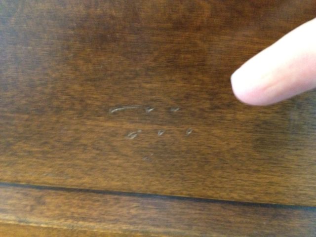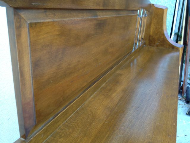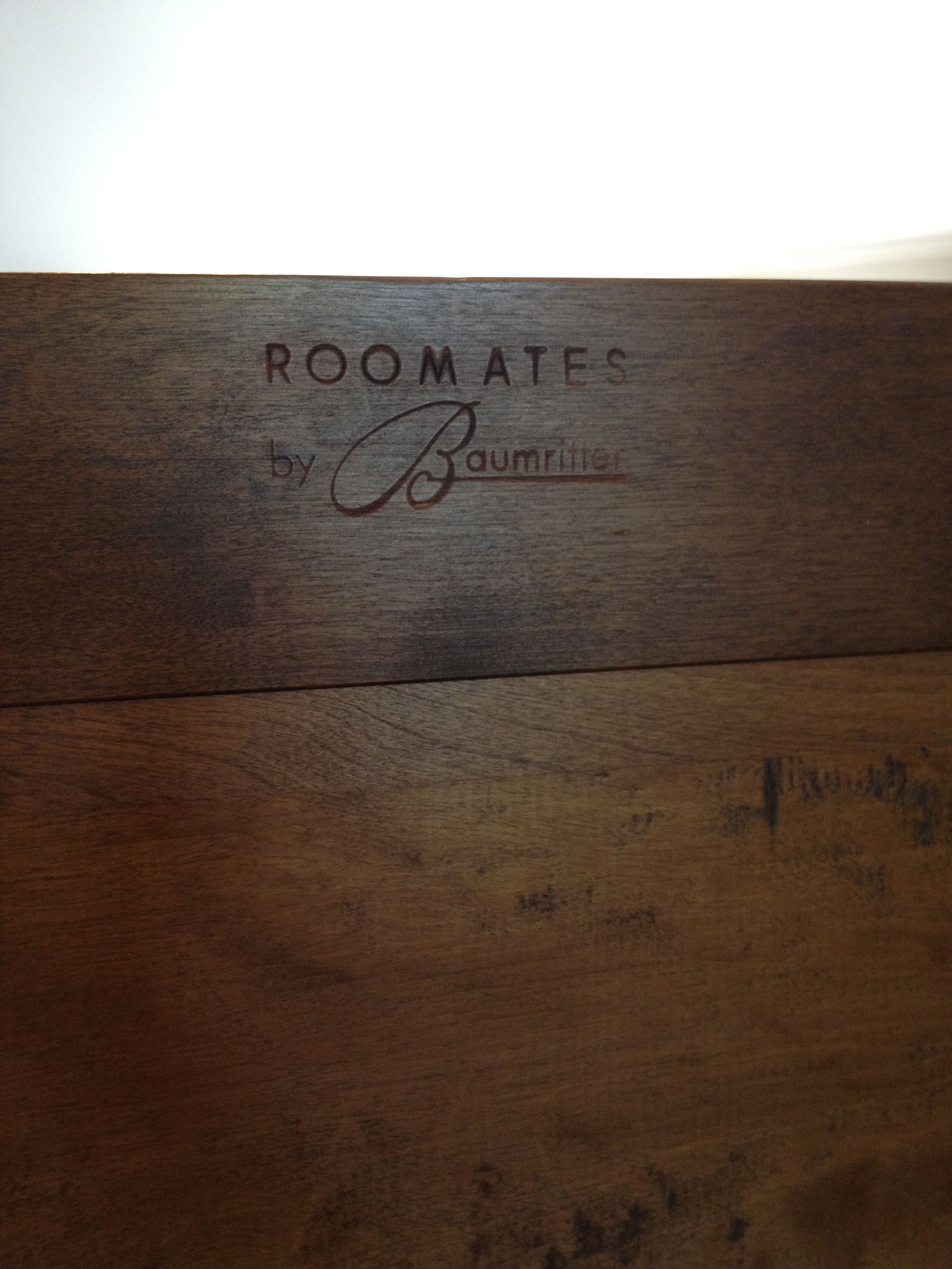 This item is in fair condition. It does have small bruises, blemishes, fades, stains, scrapes and additional pilot holes where I attached my bed frame. The faded insignia reeds Roommates by Baumritter. I know Maple was often used in Baumritter furniture, but I don't know it this wood is Maple. What wood is this?