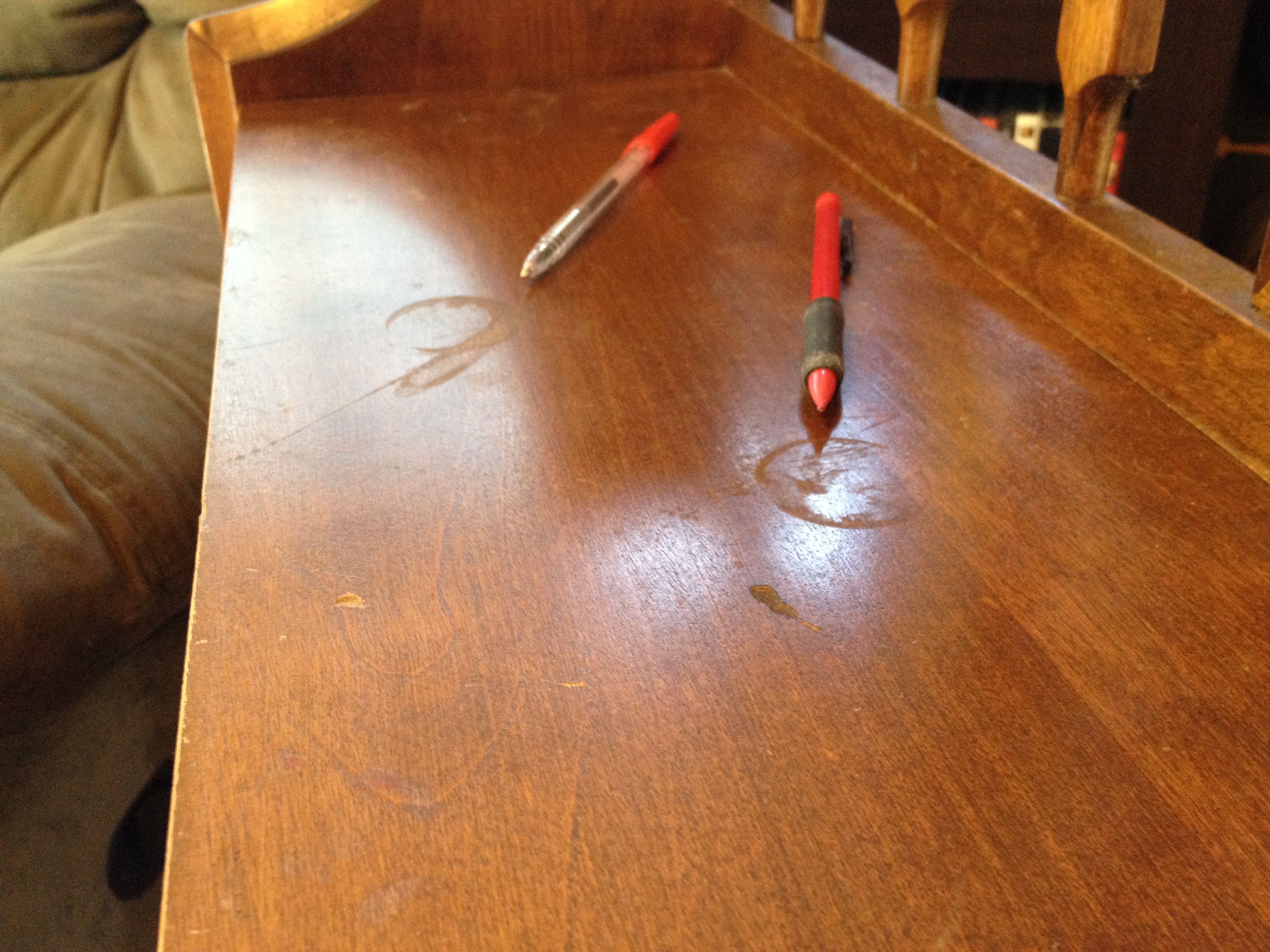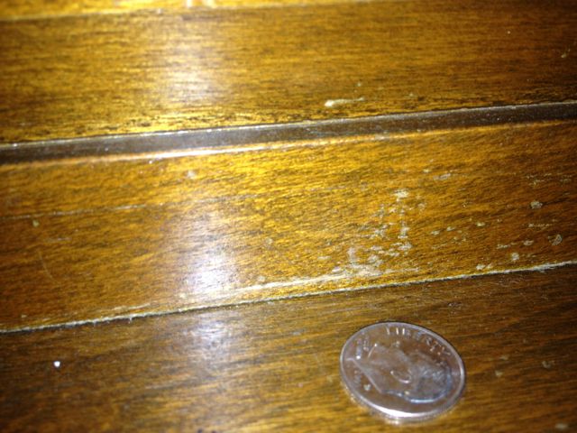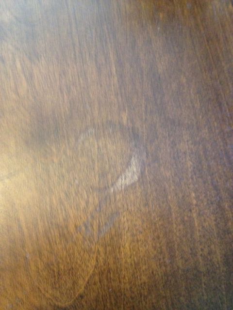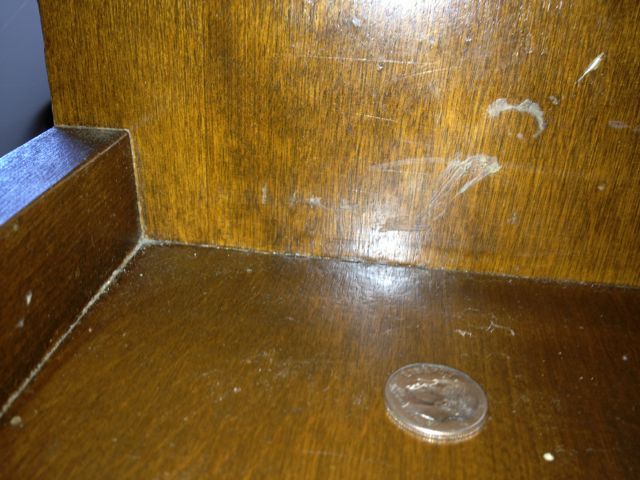 Despite the surface imperfections, the coloring holds smooth, bright and even. The photos show color variation. The color I would describe is umber, maybe burnt umber with golden hues depending on the light. There are some places where the varnish seems to be affected from a water stain, which I've tried to show in the photos. I washing this with goof off to try and remove muck, but was affraid I was etching into the varnish.