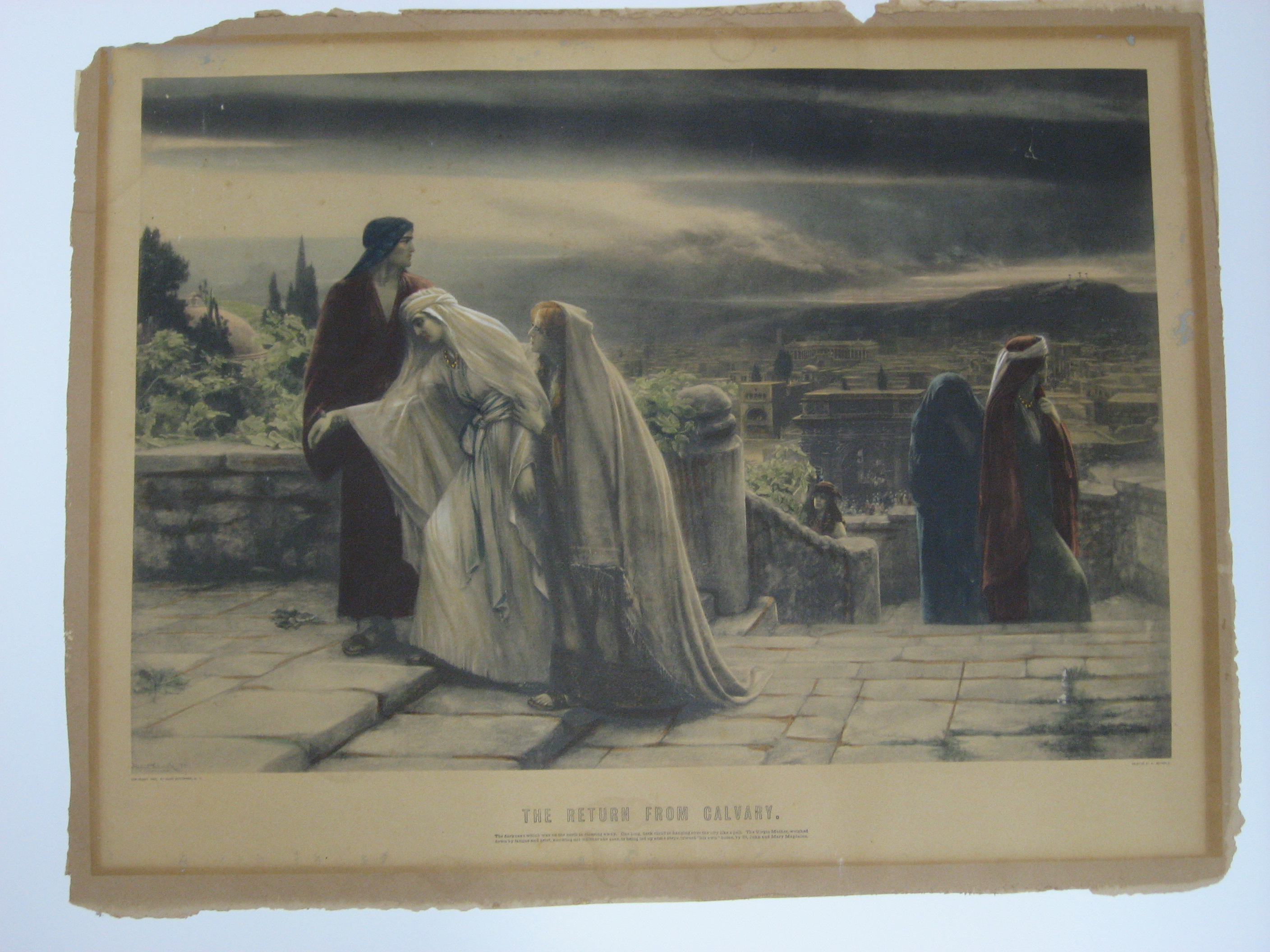 The piece is of St. John leading the Virgin Mary up the steps with Mary Magdelan assisting. There are two people below on the steps. And a third person below them which I assume is the "water jug boy" I've heard about. There is a dark cloudy sky. It has full color which is in wonderful shape. No fading that I can tell. There is acid burning along the egde of the piece from the mat that was originally on it. And the mat was literally glued to the piece. It was torn in some places that will be covered when reframed. I had no choice but to cut the remaning attached part from the mat. The artwork is no longer the original paper size. It appears to my trained eye as a custom picture framer that it maybe once had broken glass in it. There is a angled scratch in the sky that has removed the color there consistent with broken glass. It was also kept in an area where it received moisture damage. Not direct moisture damage, but it does have a bit of staining from mildew.