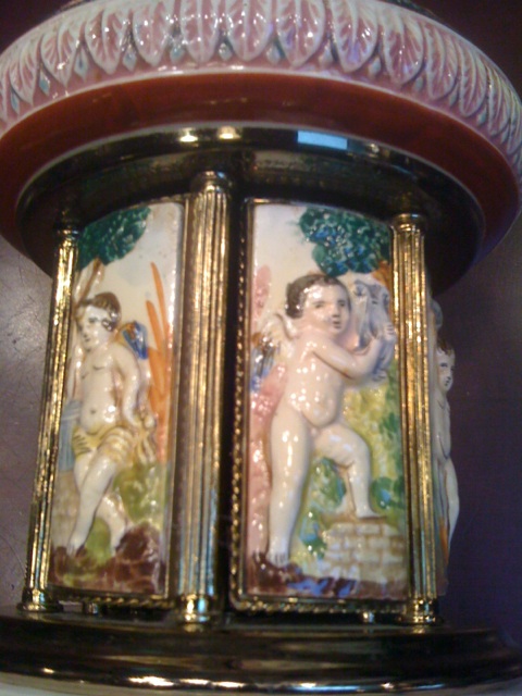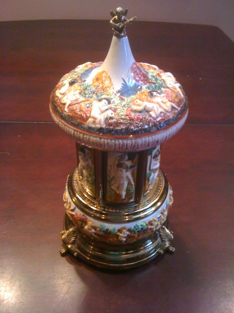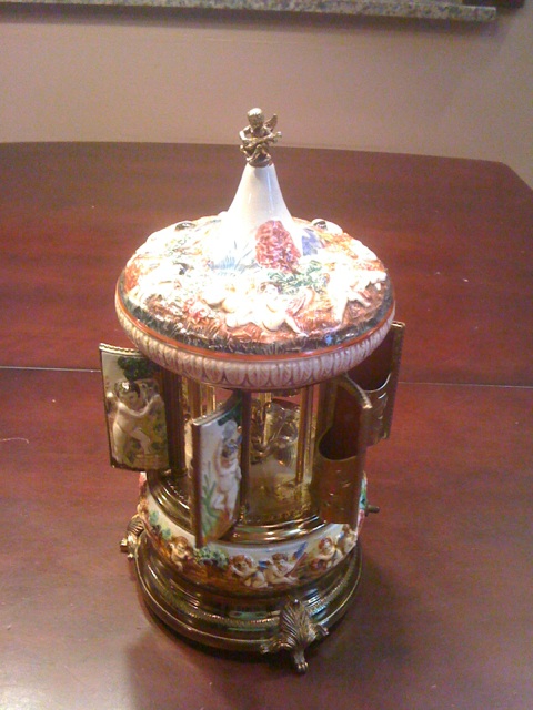 Beautifully detailed music box spins as little doors open and revolve.