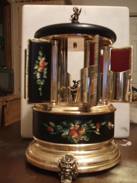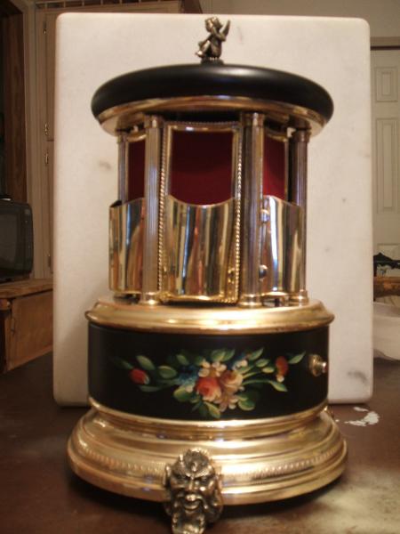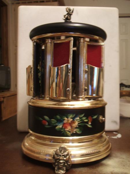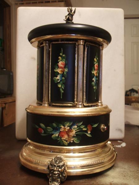 I believe it was used as a lipstick or cigar/cigarette holder. It has six holders when opened by a button on side after wound up on bottom, reveiling statue inside playing instrument atop a pedeistol. It stays open a few secounds and closes, until activated again.