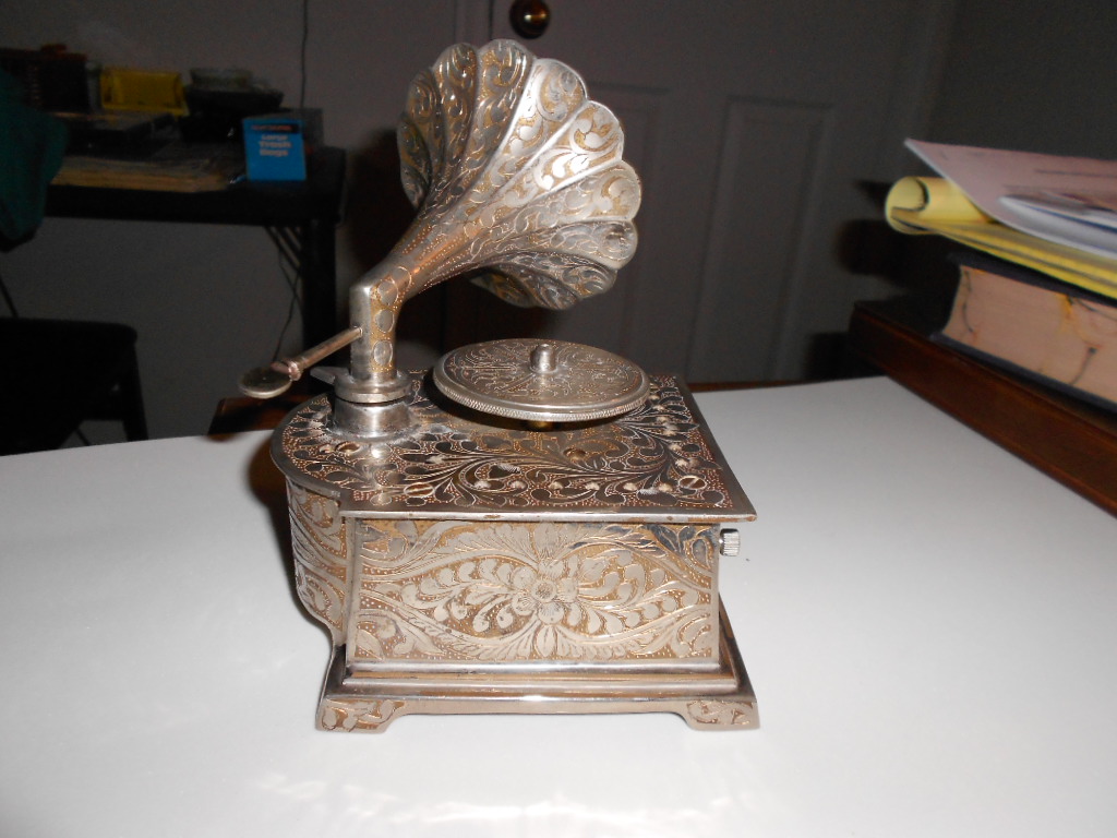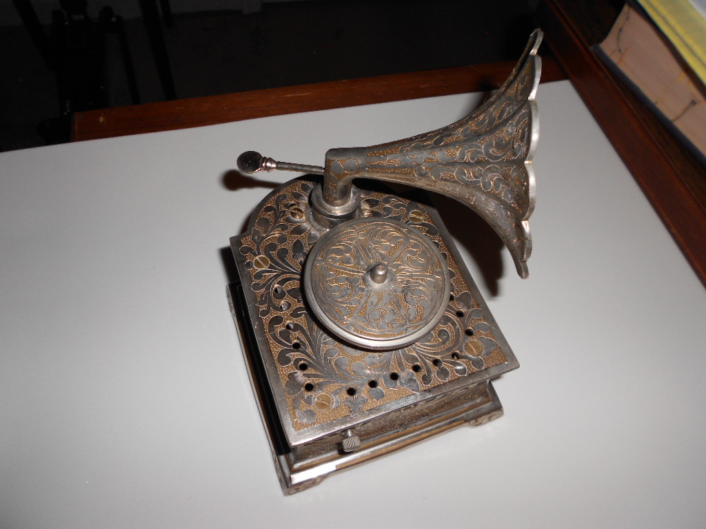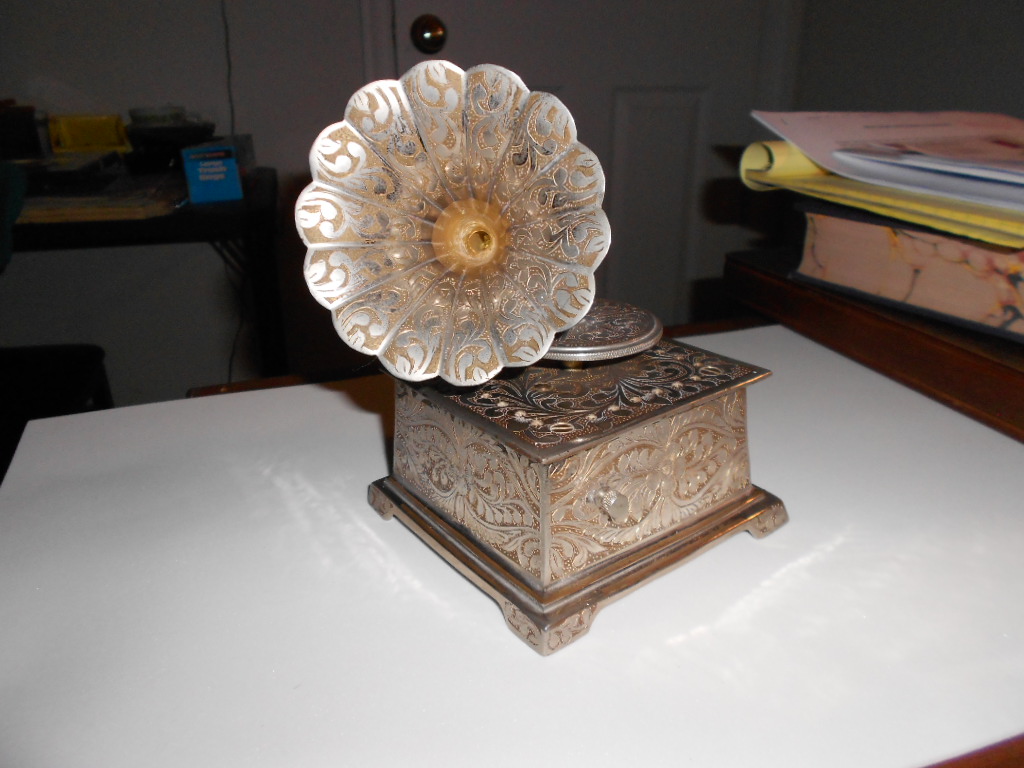 I cant find any info on this piece...It is a music box made by Reuge with a swiss musical movement that plays The Emperors Waltz and Anniversary Song...The horn on top swivels 360 degrees and the sound comes out of it...its weight is substantial, it is very well made...It is silver on the outside with leaves and vines motif...intertwined between the leaves and vines is gold inlay...This design appears along every surface of the music box except the bottom...it is also stamped "10" on the bottom of the casting...when I took the bottom off, I didn't see any markings on the movement, but the inside casting was gold...I need your advise on where to find its history and how much it is worth...any resources to assist me in my research is greatly appreciated...thanks