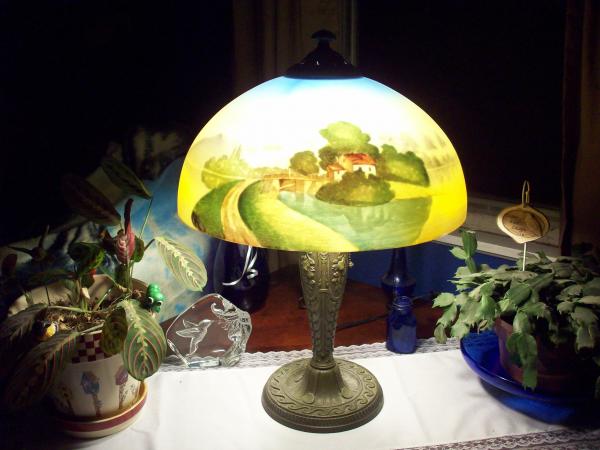 Glass globed lamp. Painting is on the inside of the globe. Globe and paint on it is flawless. Base has slight wear but is in excellent condition.