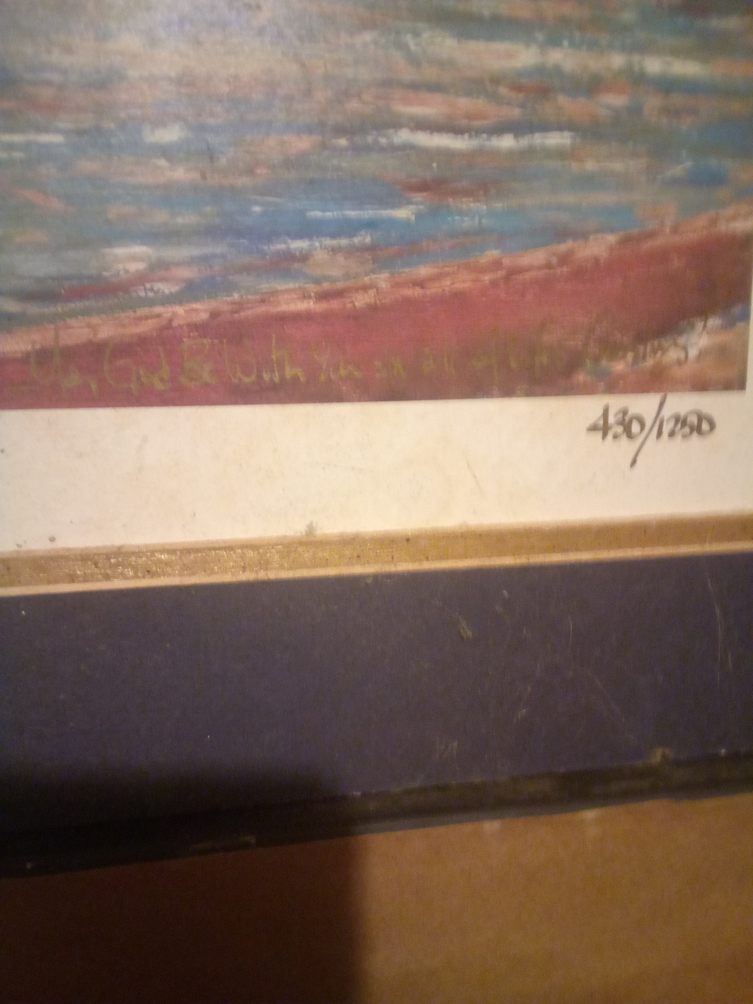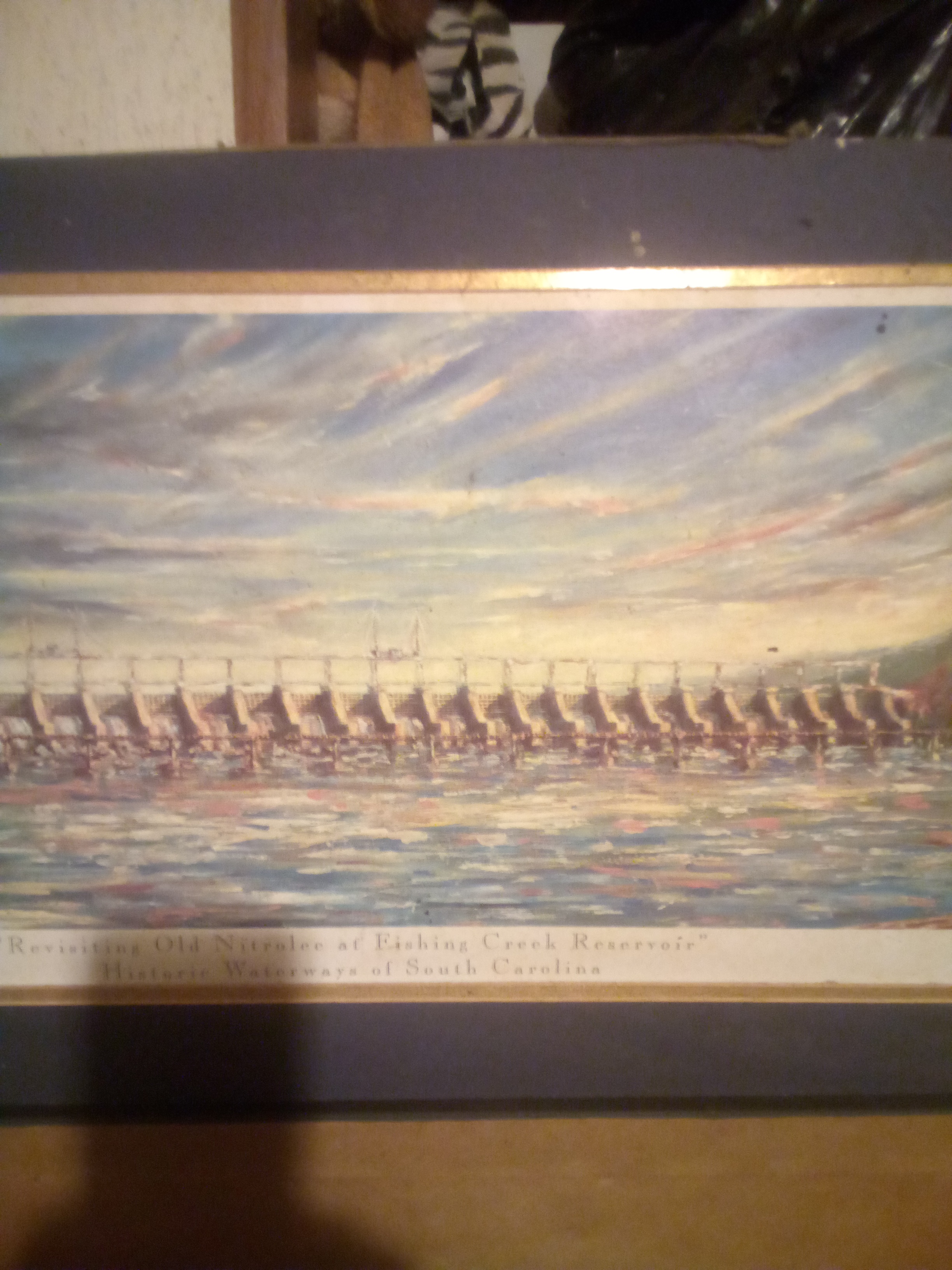 Physical Description: This is a limited edition print titled "Revisiting Old Nitrolee at Fishing Creek Reservoir: Historic Waterways of South Carolina." The print measures approximately 1 foot tall by 3-4 feet long and is made of paper. It is numbered 430 out of a limited run of 1250, indicating its collectible nature. The print features a vibrant depiction of a waterway, showcasing a blend of blues and earthy tones.
