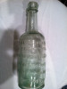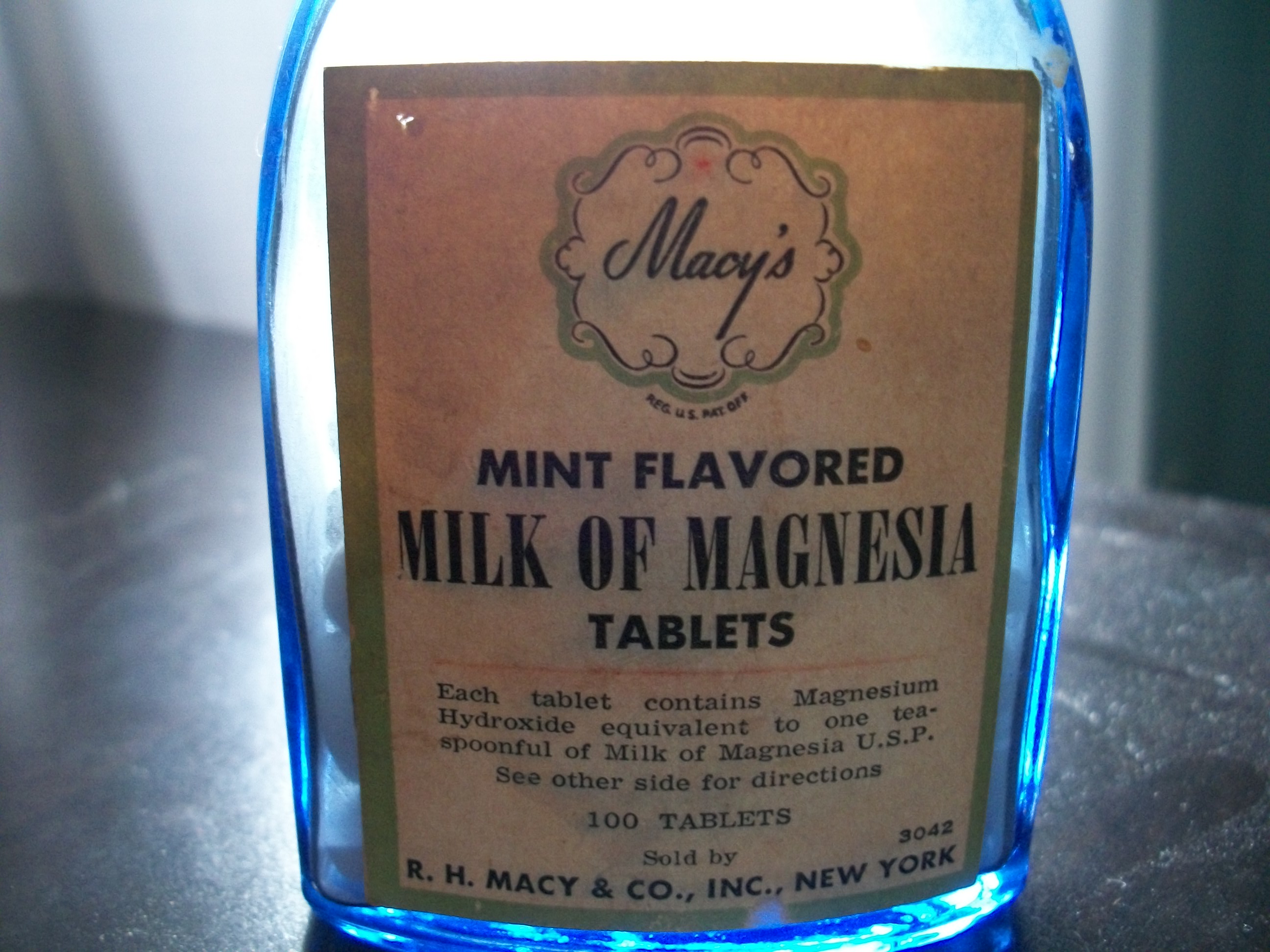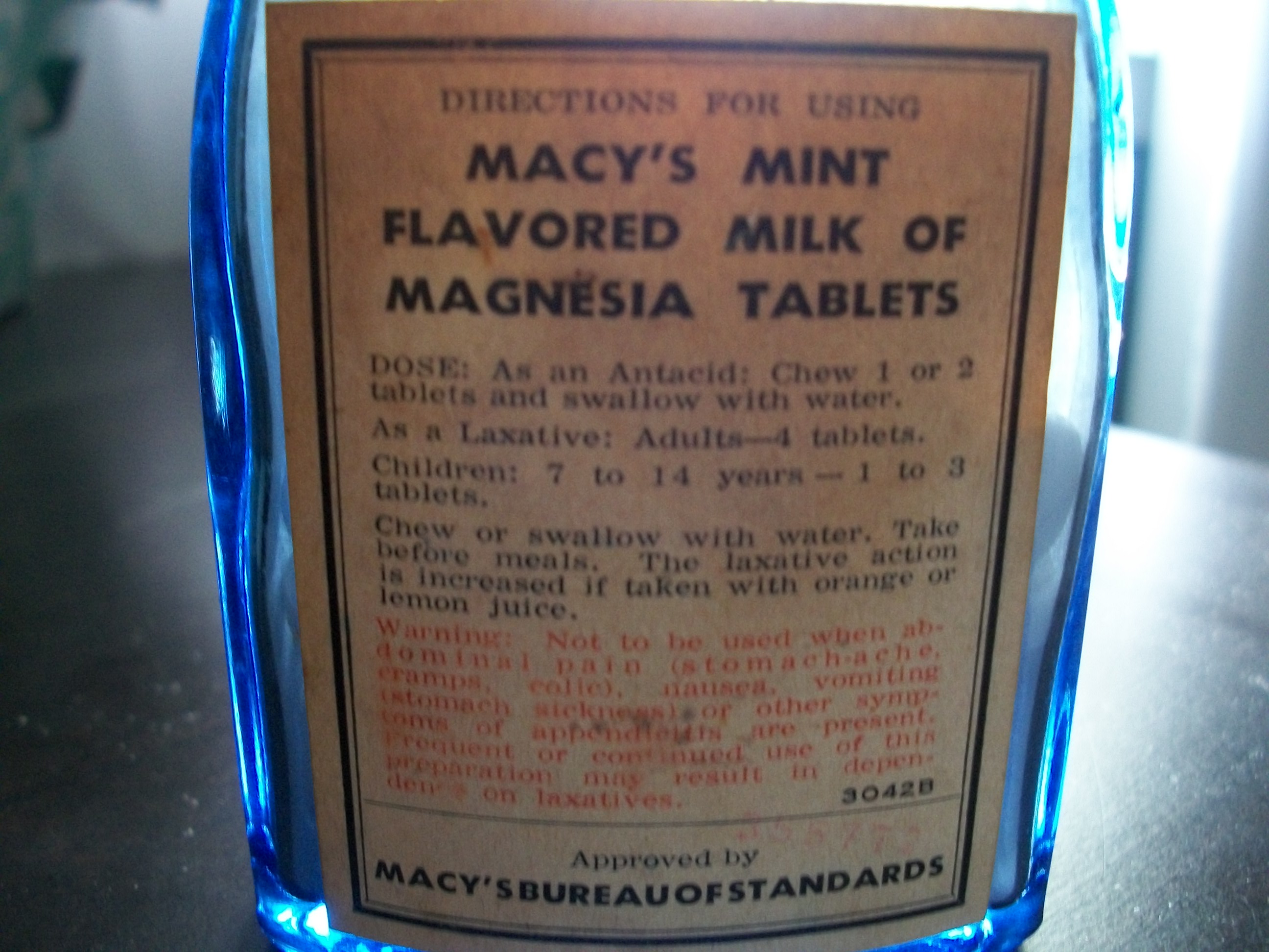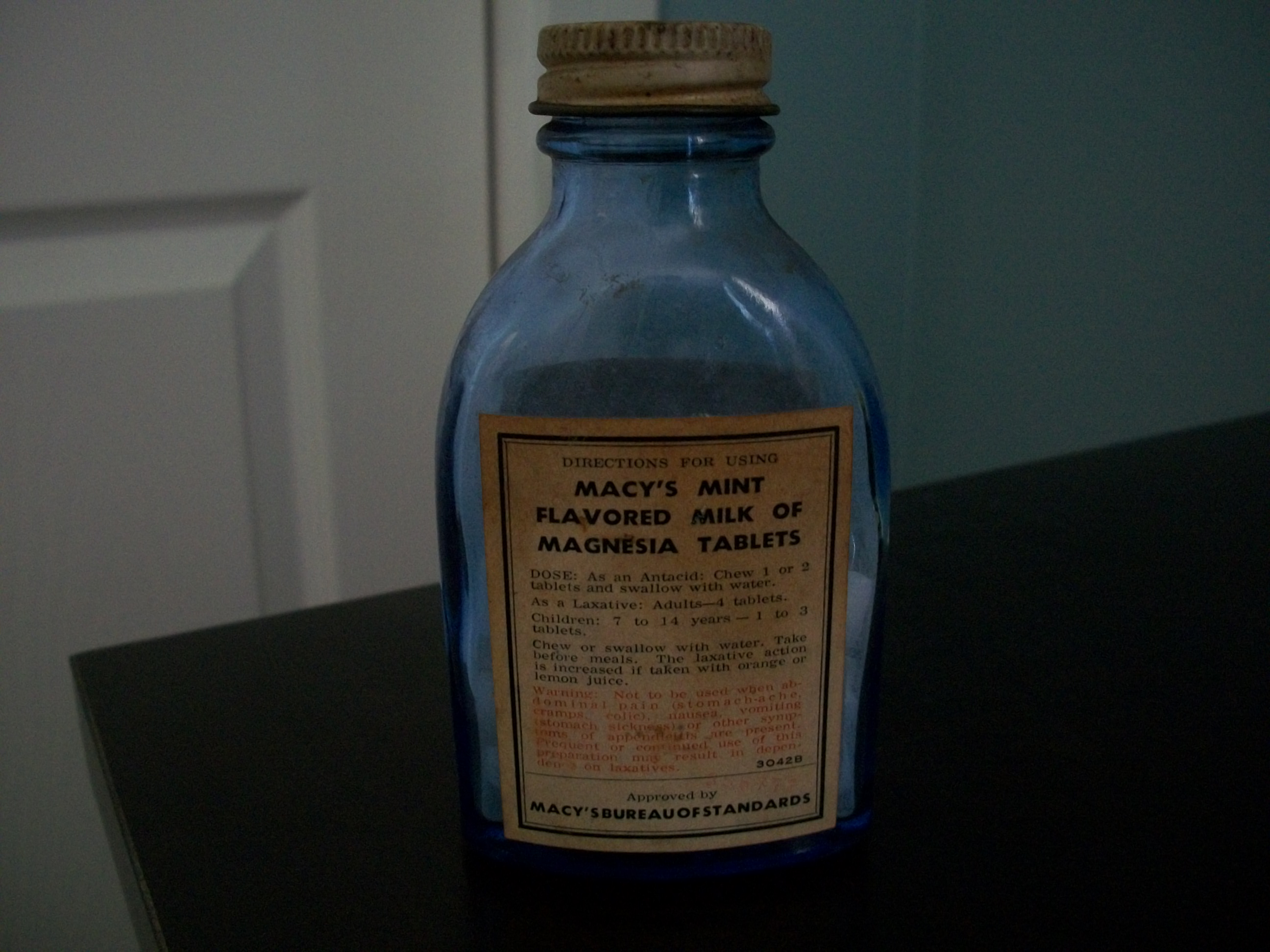 The bottle is blue glass and measures approx. 4 1/2" tall. It is also 1/2 full of tablets and has a screw on top. Label is yellowed.