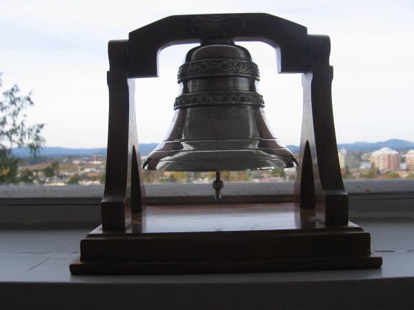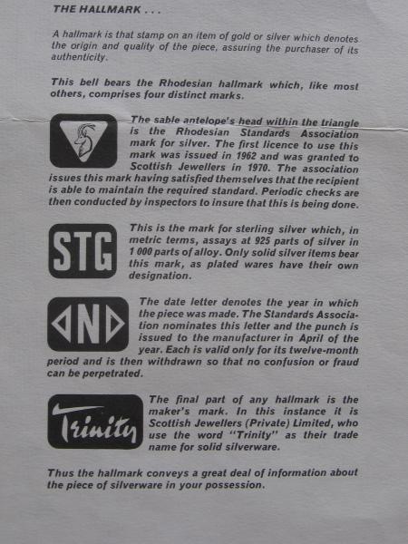 sterling silver commemorative bell in a Rhodesian mukwa frame