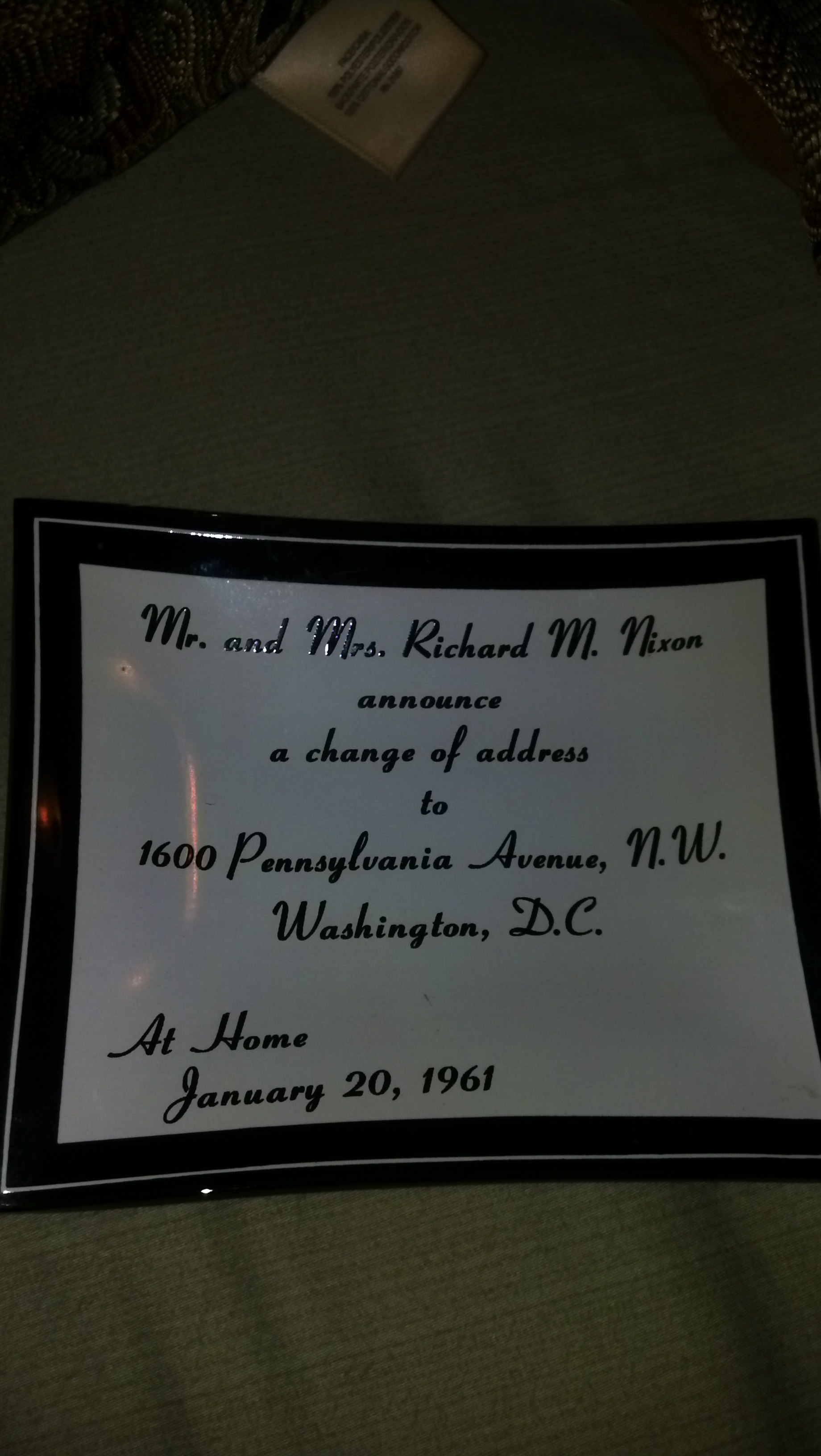 This is a glass black and white dish that was used to commemorate the President Moving into the White House it states: