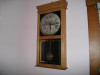 It is a wooden clock and has the clock on top and on the bottom part there is a gold ding dong thing that click and moves with the clock. It has a little 5c on the bottom part of glass door. Has a latch on the side to open that door.