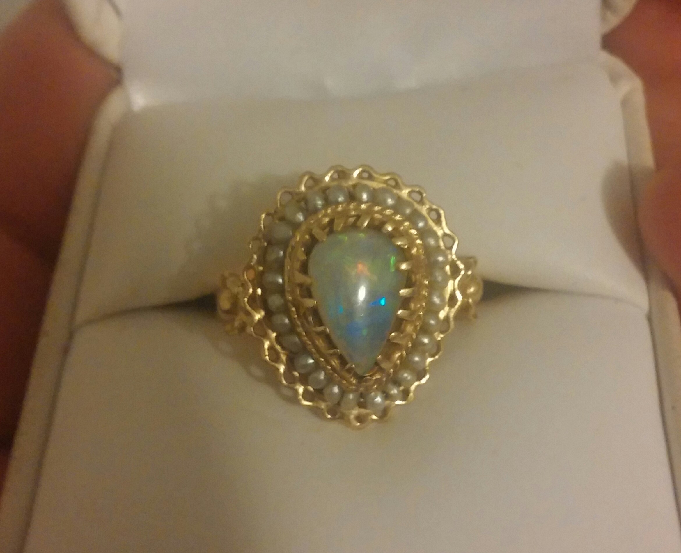 Gold Ring stone or gem in middle, unsure of what the focus material is made of. Gem or stone is surrounded by what looks like pearls. Stamp inside of the ring, can't make out what it says. No soldering marks, scratches, or paint.