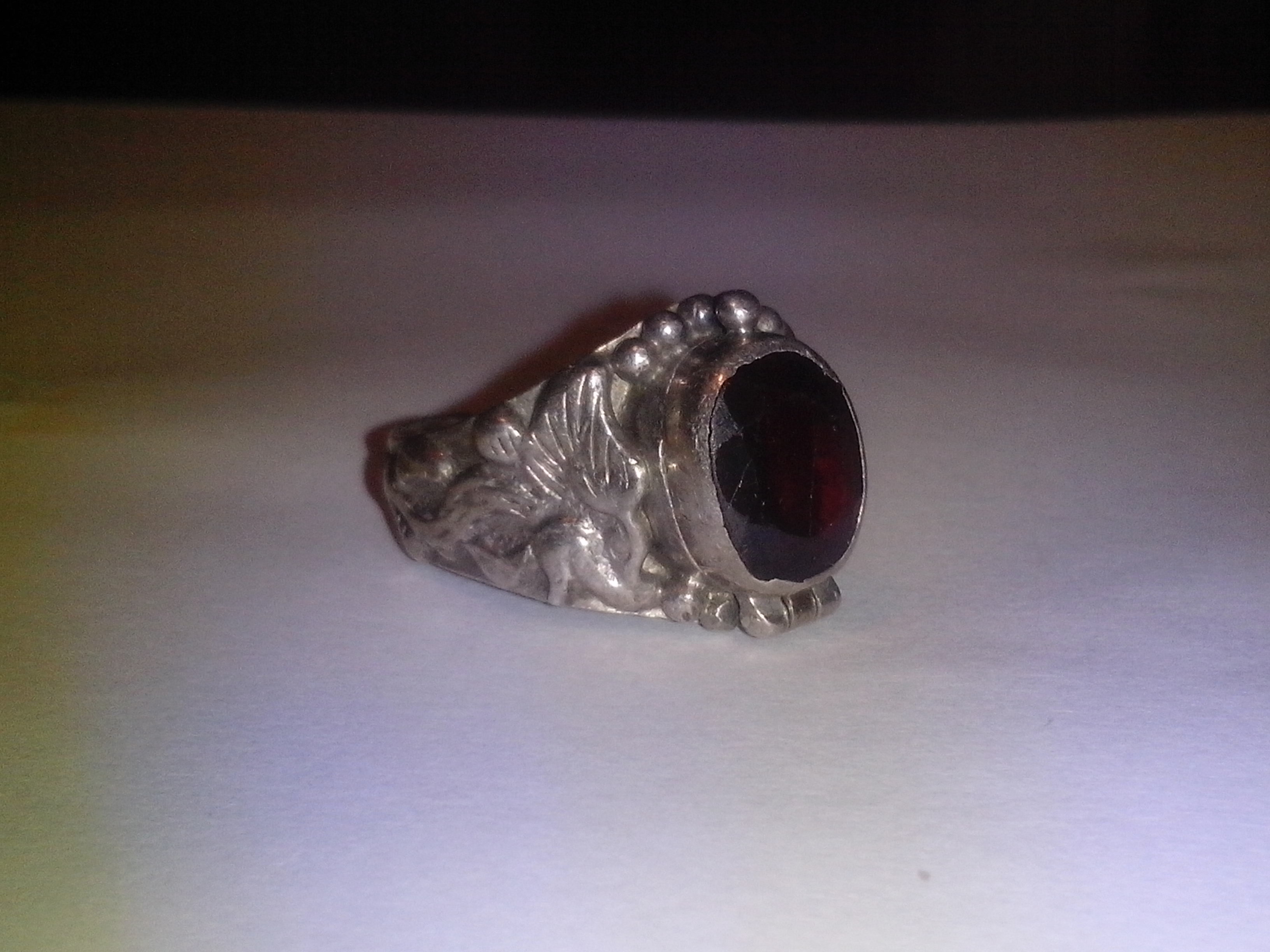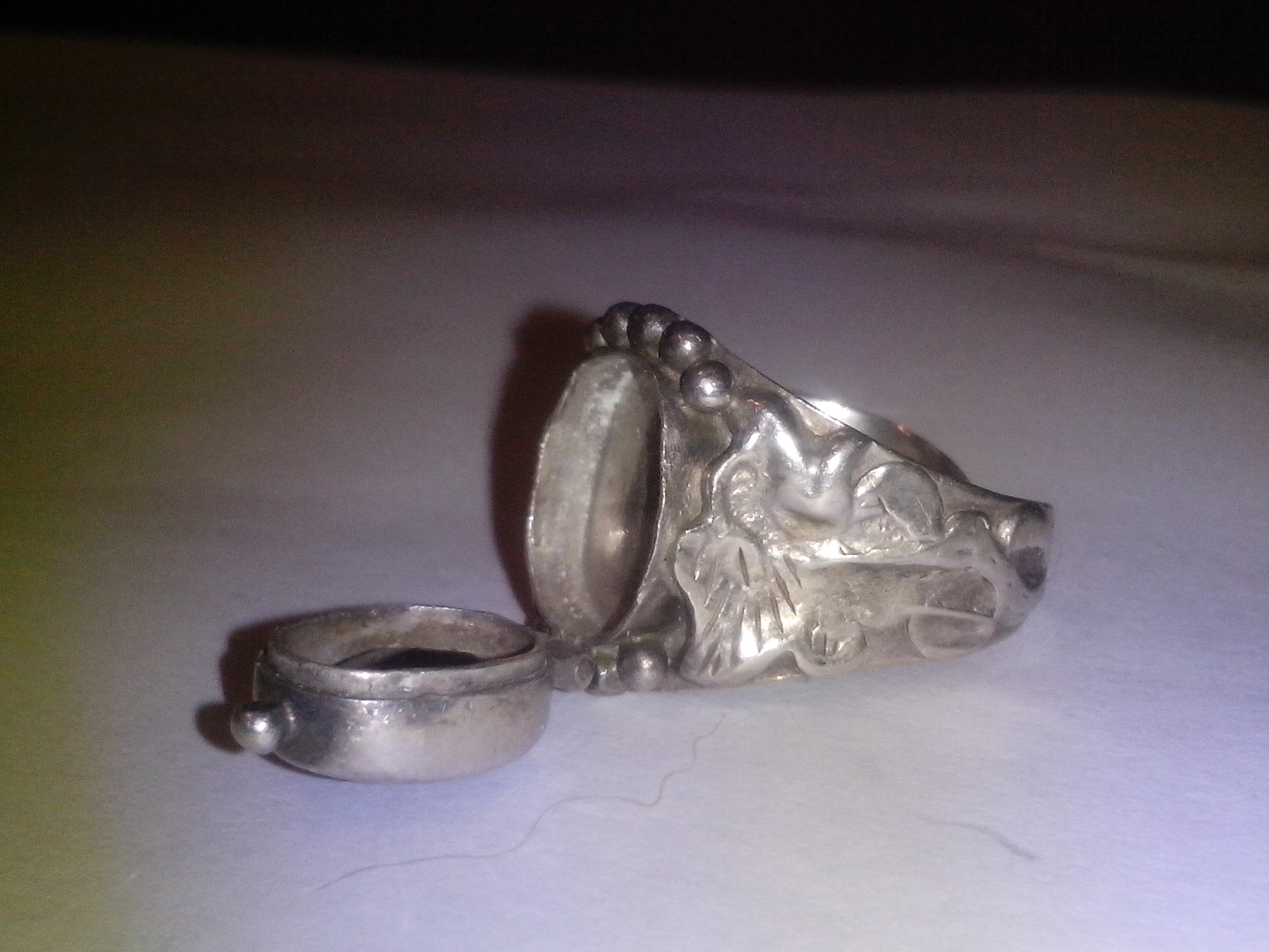 I also found this ring with secret compartment and a red stone in it. It looks like its silver and hand carved.