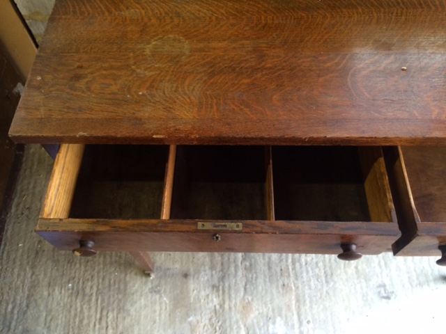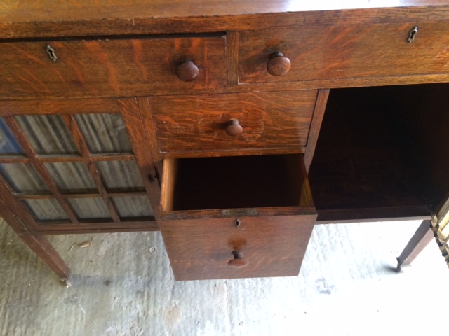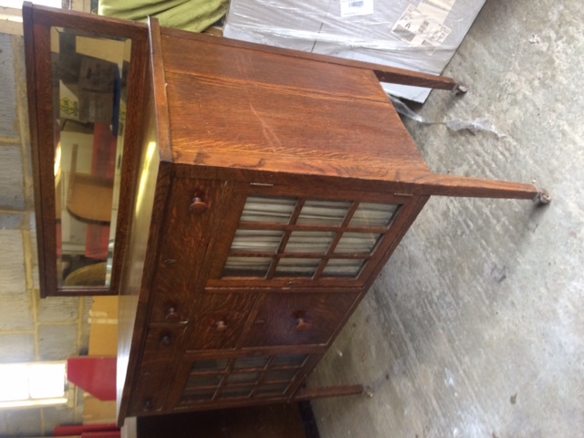 its a very nicely designed oak sideboard with a bevel led mirror and two glass fronted cabinet doors. A water stain on the top surface. All solid oak, quarter sawn I believe. About 51/2 feet long, 2 feet deep and height of 31/2 feet.