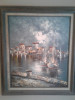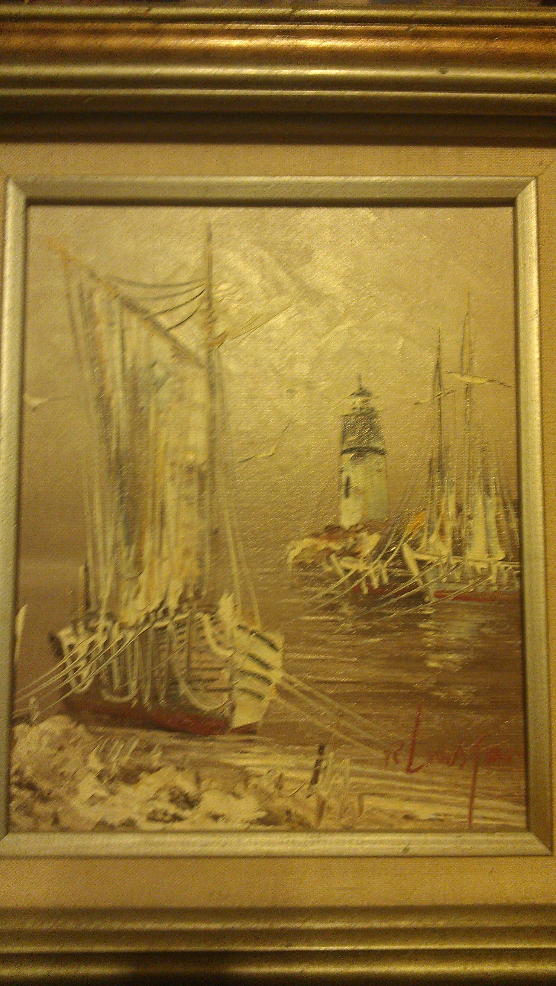 Description 2 ships tied to rocky shores, lighthouse, water, seagulls w lil isle. Tan, creme and browns. 3 dimensional looking, due to lindstrom's style of overlapping paints to form a raised form.